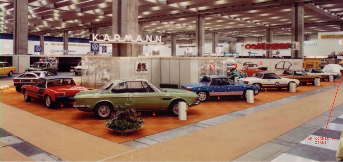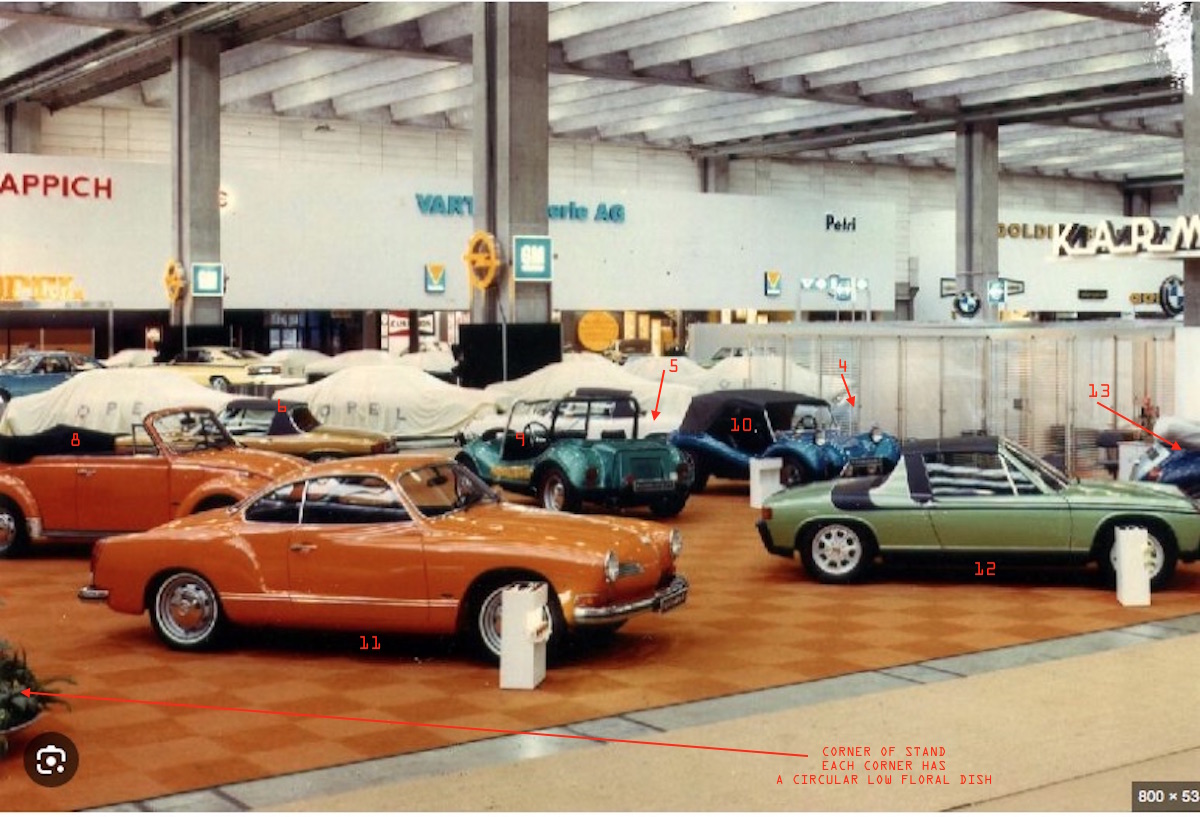 re your question whats behind the wall at K stand frankfurt sept 1973. there are 13 cars. 1. Audi concept by Guigiaro. Asso di Picche concept 1973. joint venture between Karmann and Guigiaro for a pitch to Audi (VW AG). (possiblly tha star of the stand?) 2. 914. red with graphics (sent to Paris in October). 3. BMW (sharknose) coupe. built by Karmann. 4. 914. the blue stars and bars flag car. 5. 914. the white UK rondel graphics flag car. 6. 914. the german flag grahics car. 7. 914 (either the white stars and bars or the white union jack, not enough res). ------far corner of stand------- working back. central section of stand. 8. red karmann beetle cabriolet. 9. metallic green karmann buggy. 10. metallic blue karmann buggy. --------------- photo 2 - diagonally opposite cnr of stand. 11. orange karmann ghia. 12, 914 metallic green with black graphics (sent to Paris Auto show in October). 13, VW cab beetle. blue and silver. silver paint inside front hood and engine lid. with VW star steelie sport whees. ------------------ 13 is the last car. nothing between 13 and 1. this is the #13 beetle from frankfurt sept 73 and the third 914 that was sent to Paris in October 73. date of K Post is April 73. cars being prepared then. #! car. audi concept from karmann post later in 1973 published after frankfurt show. there would not appear to be an early can am prototype (#1 that were looking for) at Frankfurt apart from the cars you already know about. what was missing from Frankfurt was one of the five flag cars. either the UK flag or USA Flag car on white. also missing was the third car from Paris show with the two black stripes on top and positive porsche side stripes. --------- was there something on the Porsche stand at Frankfurt with the Turbo Display prototype. so far only two photos i can find. all that shows up is a 914 1.8 euro model. in what appears to be a non standard special color. not a can am proto. there may have been more cars as the porsche stand appears to more be extensive than photos i can presently find. |