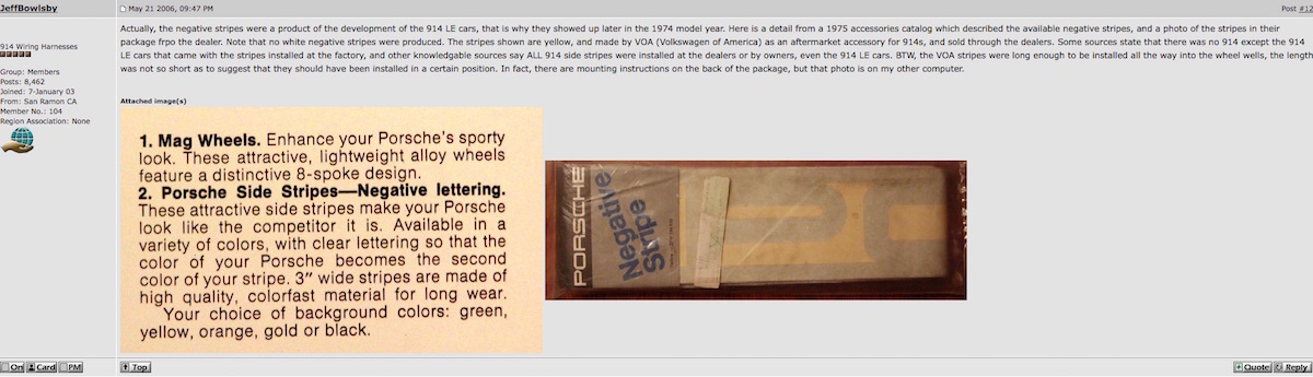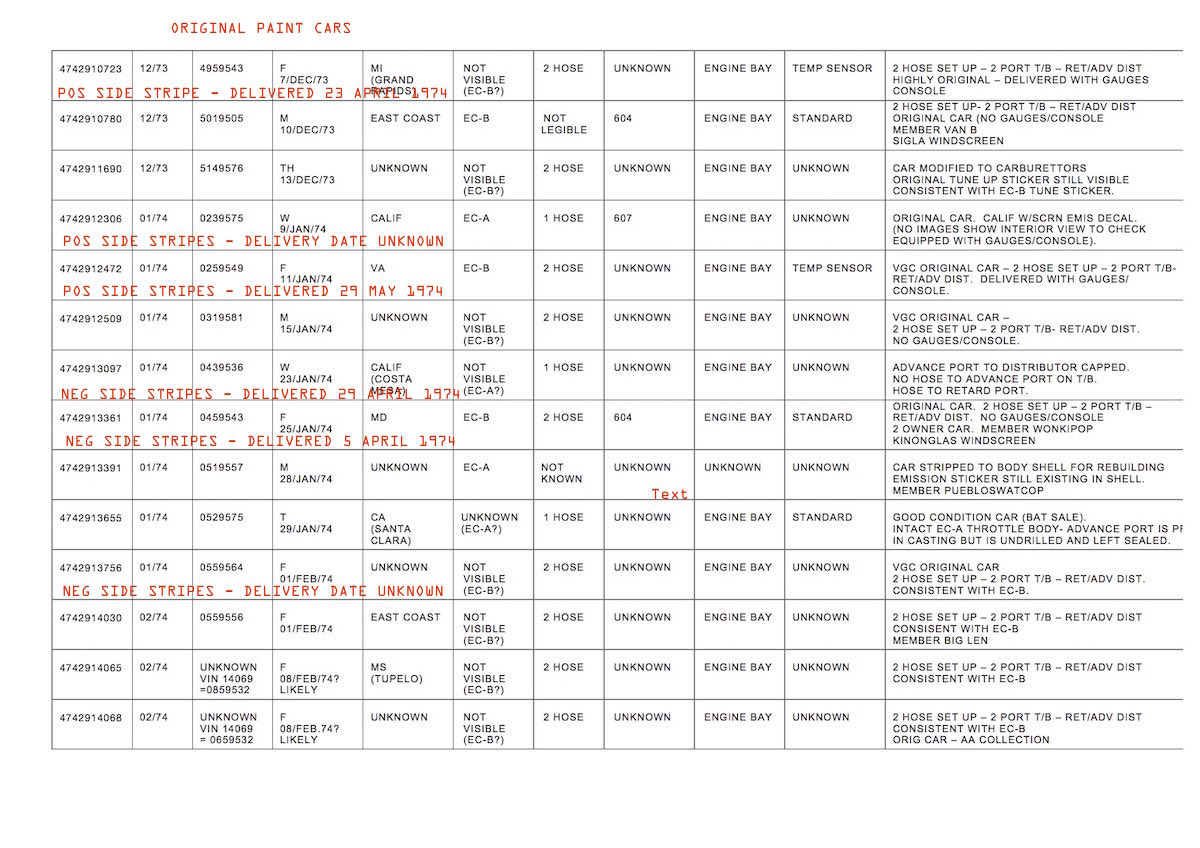 this was one of the last little things i was vacuuming up on the 1.8 L jet data. following up on this post of yours here on this website from nearly 20 years ago. and what i am coming up with is april 1974. i have just enough L jet data from very sound original cars gathered on file that shows that the first Ljets built in nov to dec 1973 were being delivered in early to mid april 1973 and were receiving the positive side stripes that were used on cars from 70-73. and the cars being built in jan 74 and being delivered in late april - may 74 were receiving the negative drop out stripes identical to the "can am" cars. funnily enough the earliest example i have collected of the negative side stripes is my car. jan 25 1974 build and delivered friday 5 april 1974. in fact of the examples i have on file with delivery paperwork etc mine has the shortest elapsed time between build and delivery. a little over 2 months. most have an approx 3-4 month lag between build and delivery. (kind of fits with the car itself, i think it was actually ordered specifically rather than bought off the showroom floor - with its sway bars, parcel bin etc). so im finding april is the cross over month where the cars get both positive or negative side stripes depending on the dealer. two of the examples i have on file with the positive side stripes list the stripes on the windscreen sticker forms. both april deliveries. i'm guessing maybe that possibly the first of the "can ams' must hit the showrooms around late april or early may. another one of those interesting things about the L jets. the very earliest of them get the positive side stripes and after that from jan build dates on more or less they get the negatives. ill sort out the data and plug it on to the end of the L jet file thread. i'll keep searching for a drop out graphic show car but i reckon the turbo prototype is it as far as public display of the graphic goes during late 1973. and then it pops up at the dealers as part of the package for the "can am" cars. all timed to start showing up on the "can am" cars before being fitted widely to any 914 if you wanted them. EDIT L jet data with side stripe info noted in. (will load up later on L jet file thread with images showing examples and documents). with so many cars repainted over half a century/so few original this is the only examples i can trust. interestingly all of them are like mine. the decals (whether positive or negative) are full length and wrap around the edges of the lips of the fender into the wheel wells. |