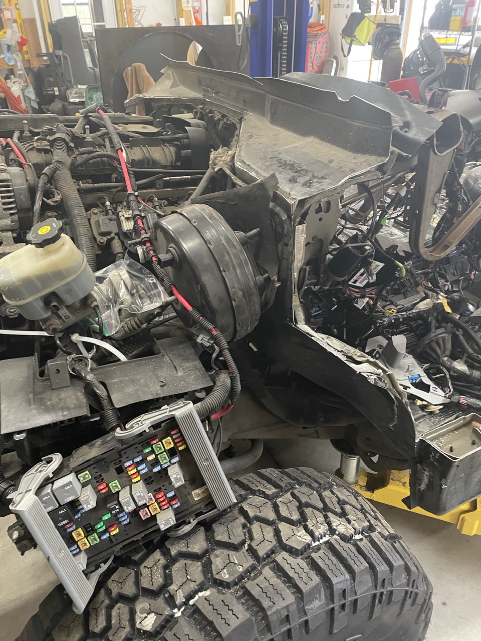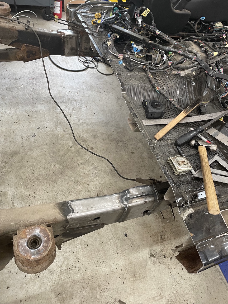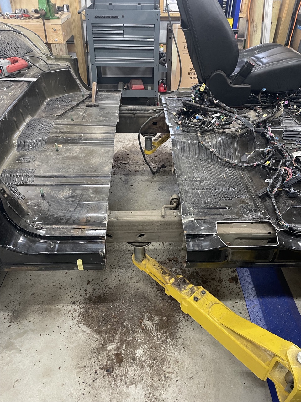 Here’s the trimmed down body and the floor with 12” sectioned out, frame cut is next. I also narrowed the firewall to match the Caddy. I’ll have to use a hydro boost brake setup when putting it back together because the narrowed firewall won’t allow for the vacuum brake booster. Also got the Caddy stripped down a bit…..fun stuff! |