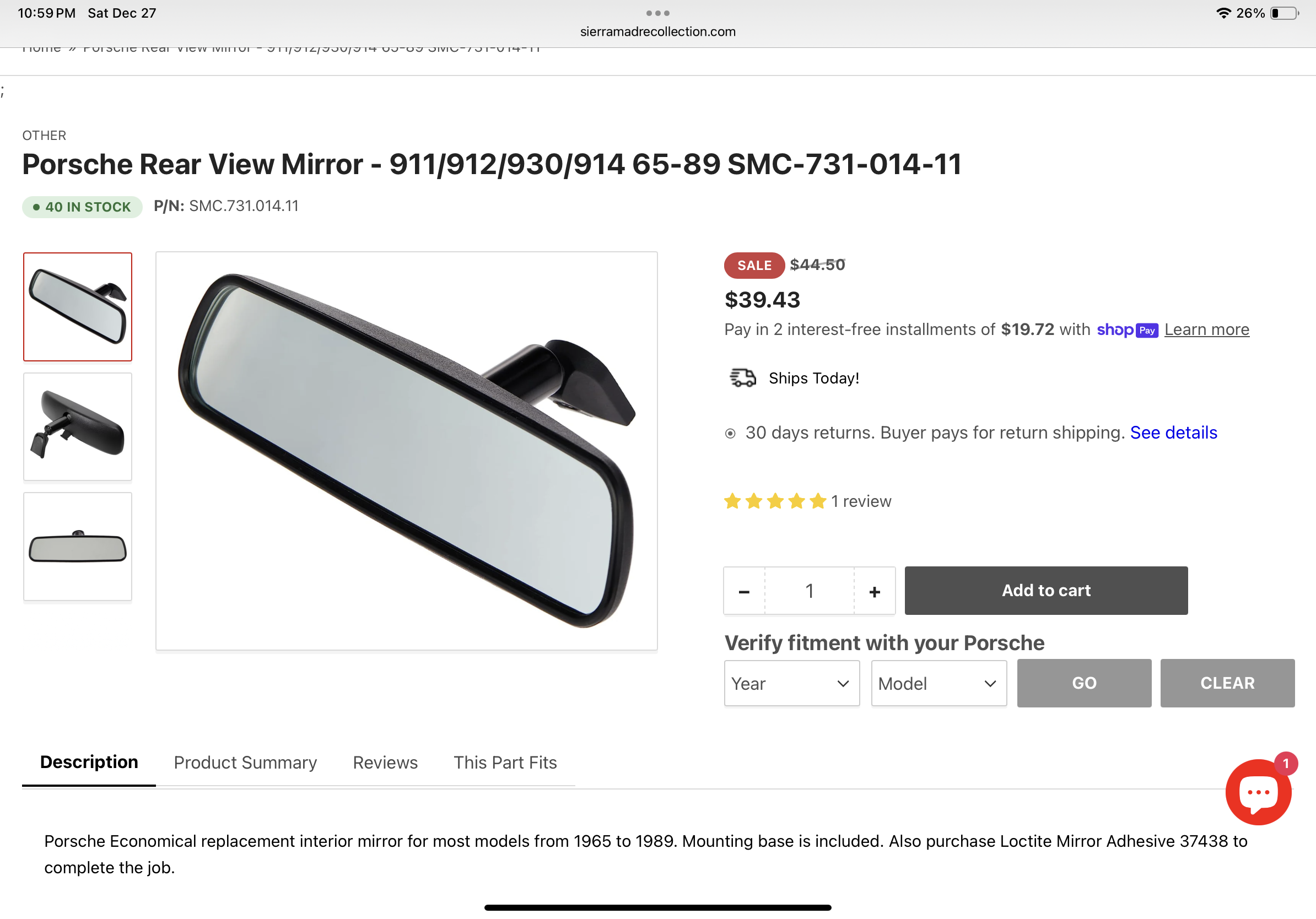 As is typical, my rear view mirror fell off. As far as I can tell, it's a stock porsche mirror. However, the mirror is no longer clear so I'd rather just replace it with something that I can see with better.
