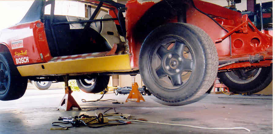 QUOTE(URY914 @ Jul 29 2003, 05:09 PM) Here is a picture of my car on two, yes two jack stands. I had it on three until my 7 year old girl picked up the front end, so I did a little shifting around and got it to balance on tow. Don't try this at home. This is kinda a stupid thing but a finally found a subject that I could post this picture with. Paul It helps that you have the lightest 914 in the world with helium in the tires and in the roll cage tubes. (IMG:style_emoticons/default/laugh.gif) |