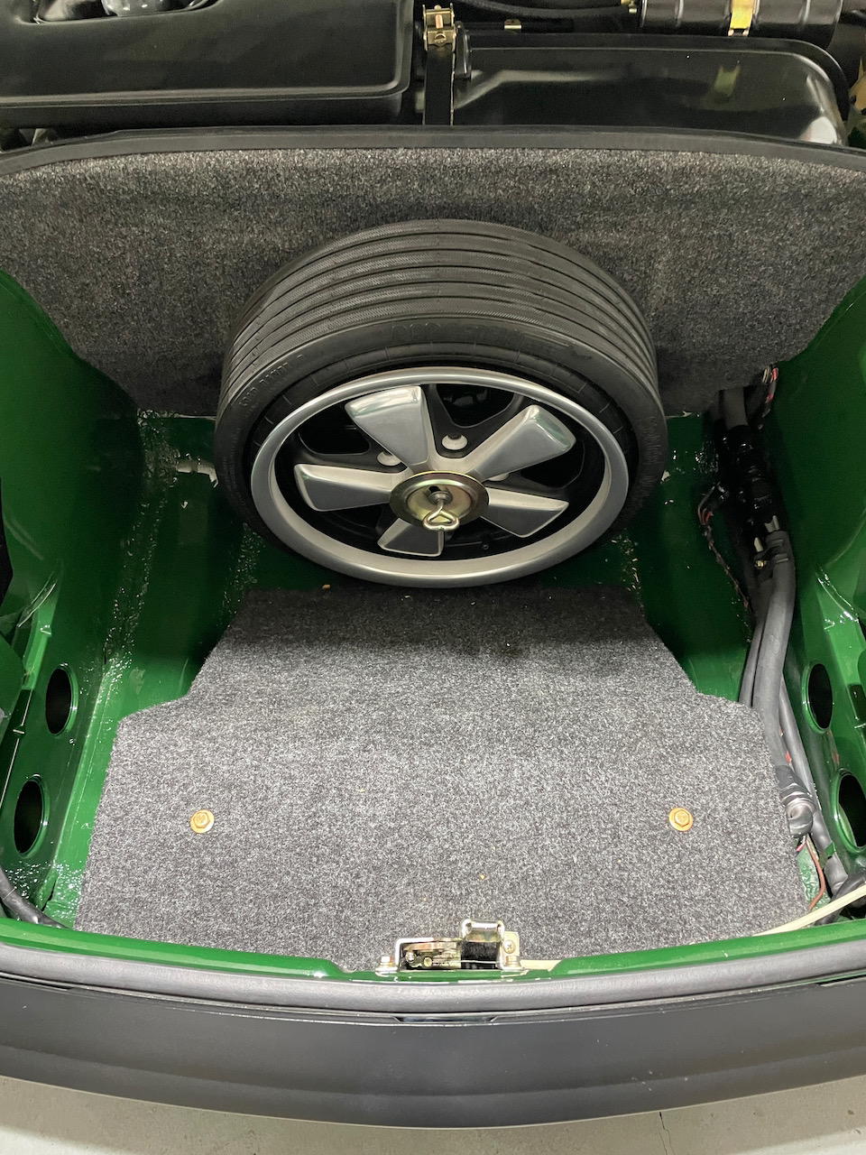 @cairo94507 @sb914 @RiqueMar Thanks ya'll for the the feeback. Going Cairo style with the wheel storage- frunk mounted on the wall at the gas tank vertically. Will this fit mine Cairo? With the tire flat, is the diameter of the compact spare much smaller than a common 15" wheel/ tire combo? I'd guess so otherwise whats the point.... I'm replacing my funky front oil cooler shroud with a proper Getty 914-6 shroud with the goal of having the space for the compact spare up front. Wheel...no problems with the backspacing for both front and back I hope... I'll go for it...the price is right. (IMG:style_emoticons/default/beerchug.gif) |