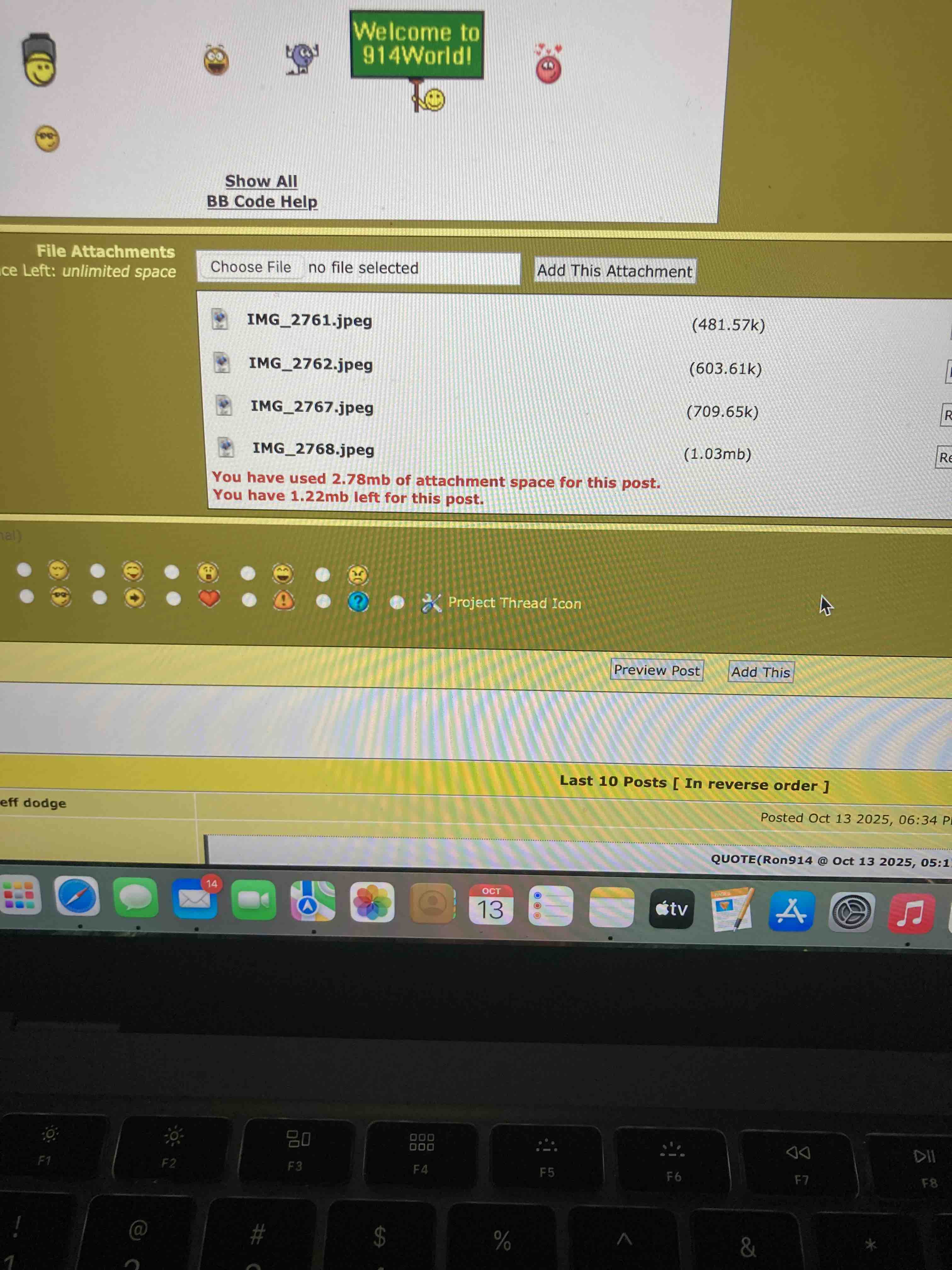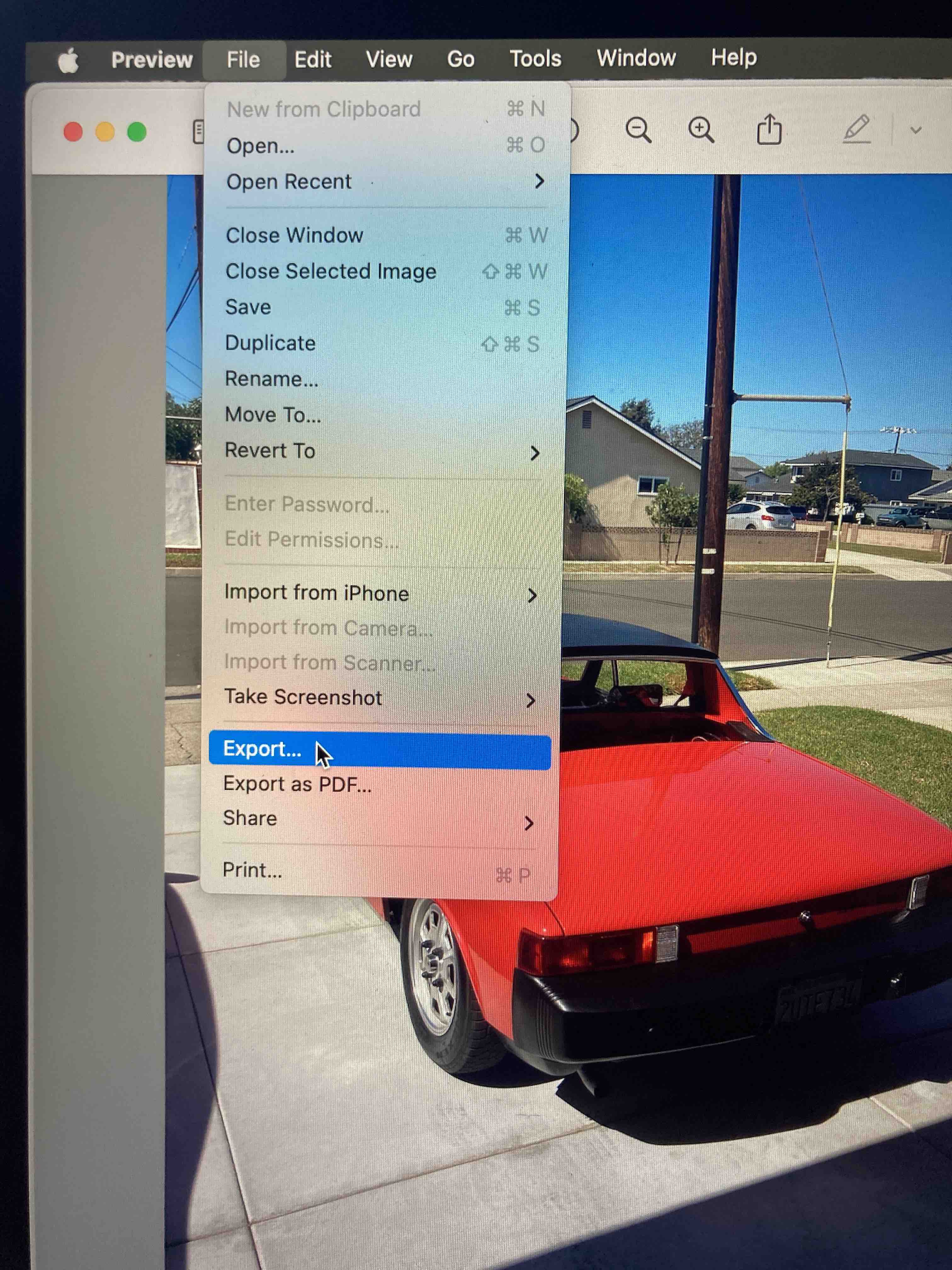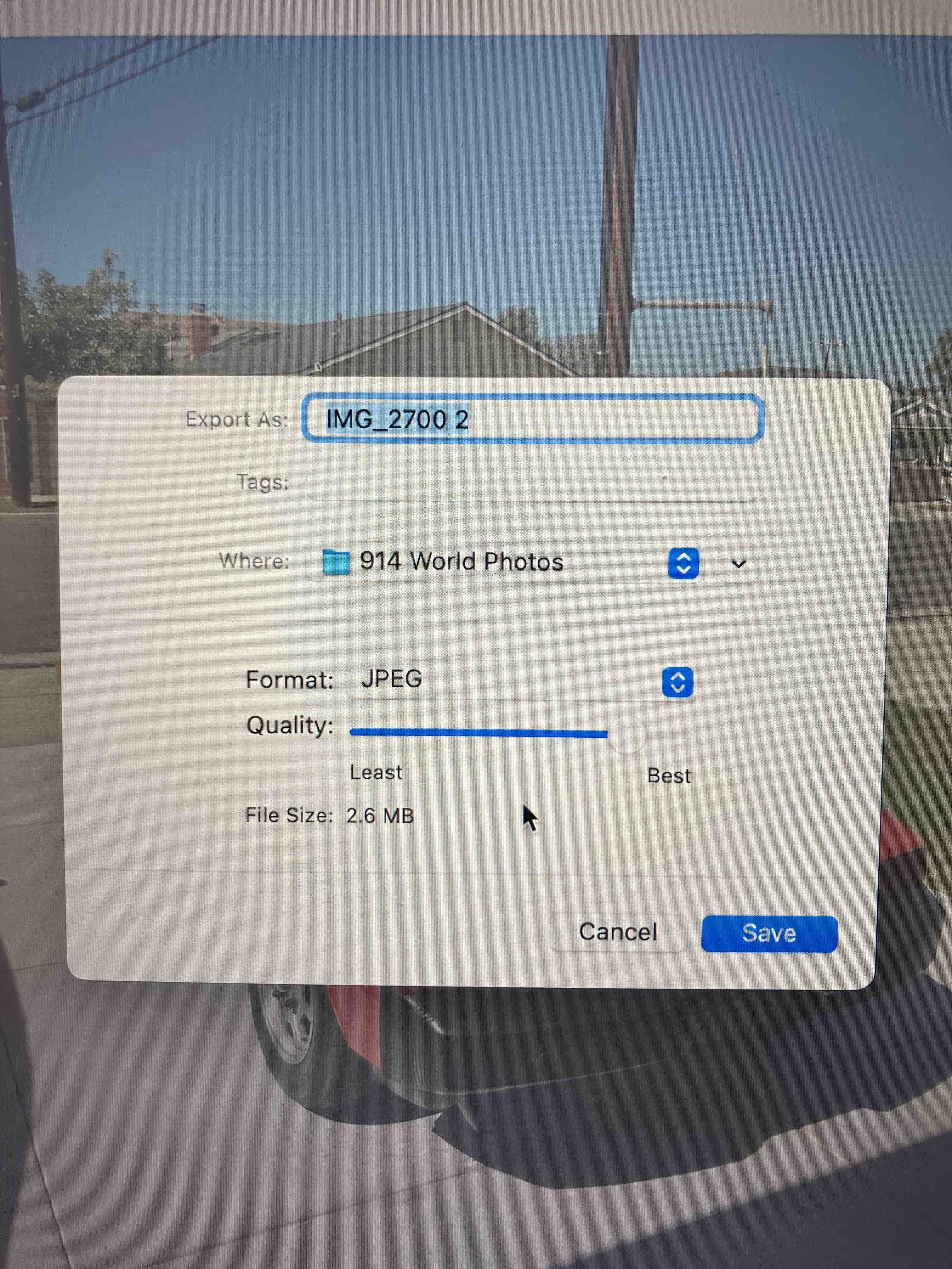 Thank you for all of your help. Let me start by saying that I am a computer idiot. I still cannot bring up photos to add to my posts. I moved my photos from my computer hard drive to the cloud because I ran out of space. Maybe that makes a difference in how to upload photos. I might have to get my son to walk me through it. Give me aluminum sheet an English wheel and a TIG welder and I can build you a body. Navigating around a computer, forget it! Thanks again, Jeff Hi Jeff, @Jeff dodge I consider myself a bit of a computer idiot too. By the way welcome to 914 World (IMG:style_emoticons/default/welcome.png) It took me three years of not wanting to ask for help because I knew I was going to be asked for a photo . Not learning to post photos was my biggest mistake I ever made since acquiring my car .The members here can provide photos , videos and possible the parts you will need one day and great support to make your ownership a pleasure .Its also rewarding to fix/repair these cars yourself. They also have cool drives and are fun to hangout with . If you have an Iphone and a Apple lap top or desktop then I can attach photos to walk you through the process , if you are a Windows/Android guy possibly someone else can do screenshots to help you . Let me know by tagging me with my screen name in a post like this ( @Ron914 ) . I will get a notification and add photos to this post . Ron Thank you so much! I might take you up on that. I have been dealing with electrical and vacuum issues that would have been great to send photos. The 914 is new to me so that would have been helpfull. The other metal and body stuff is easy. I would love to show pics of my car. Nothing incredible, but a neat car non the less. Jeff Well lets see if this helps you: The first thing to do is create a new folder on your desktop like in my Photos (This is on a MacBook Air laptop) you can then select the untitled folder and rename it (914 World Photos ).This will show up on your desktop screen as a 914 World photos folder, then select the photo from the photos album on your phone that you want to send (I selected a photo of my car , I select the download icon in lower left of the photo then Airdrop to send it to your desktop ,now open the photo and in the Preview screen select FILE , now from the drop down menu that shows up when you select FILE select Export , now you get the screen that allows you to resize your photos ( This is the most important step ,downsize by moving the quality bar from best to least which will change the file size try for under 500KB then hit Save and the photo will go to your new folder you created called 914 Photops (most photos you take with your high res camera will be 4-6MB and your post is limited to 4MB I believe so 1 or 2 photos will be all you can post . In fact a message just came up that I am out of attachments space so I will have to continue in another reply . This was a good example of why you want to reduce the file size of your photos as low as you can . ![]() ![]() ![]() 672] ![]() Attached thumbnail(s) ![]() |