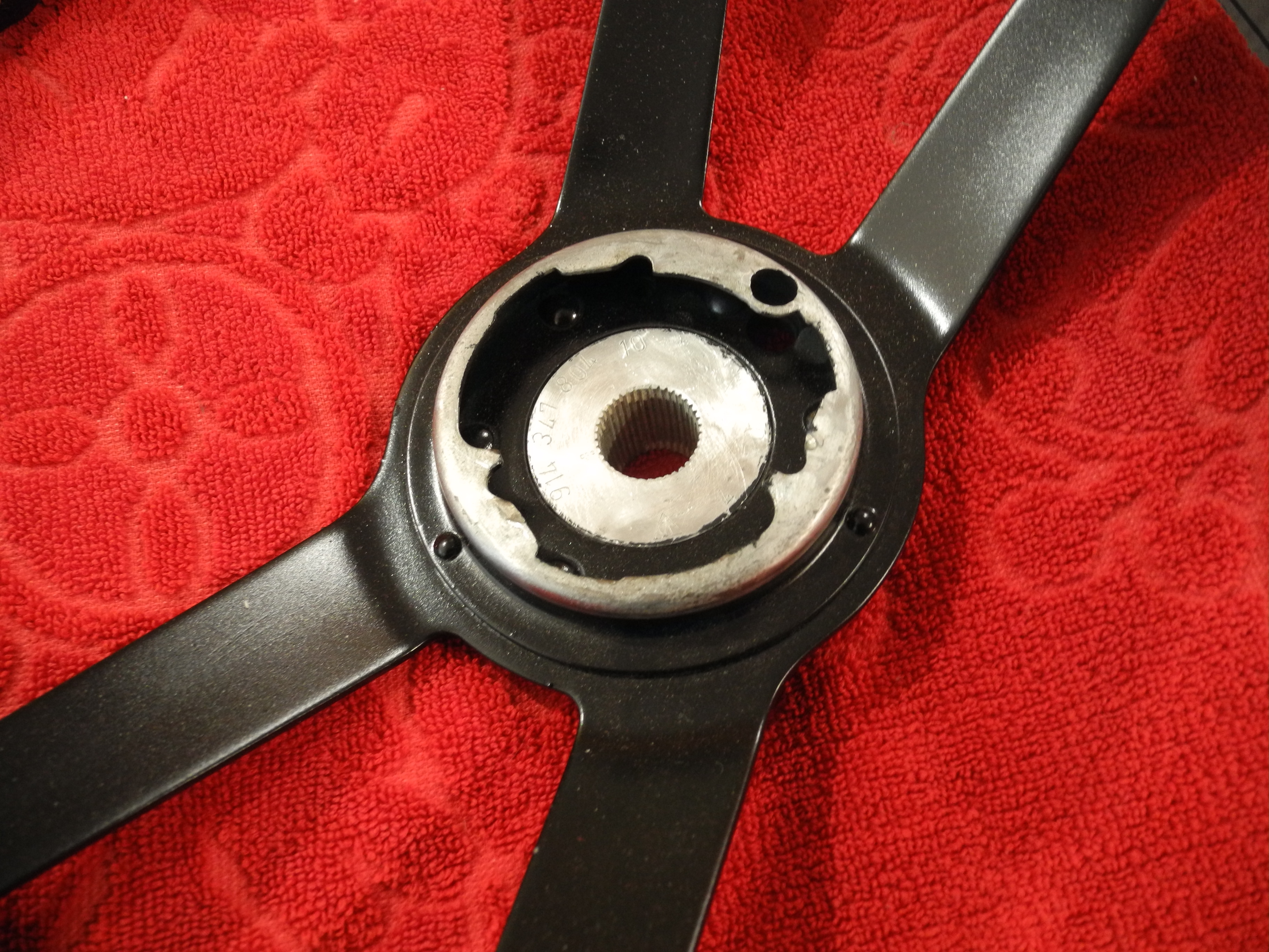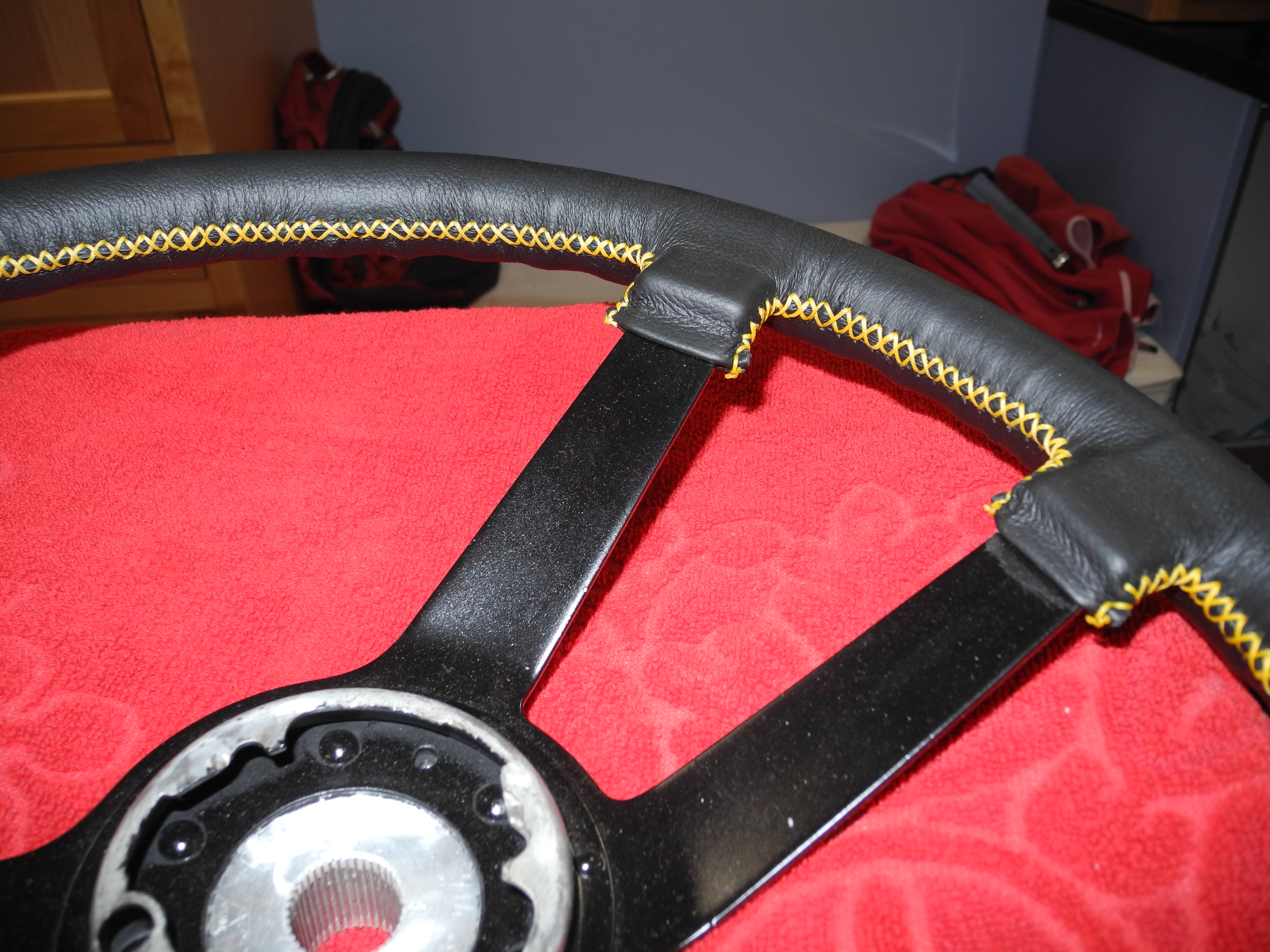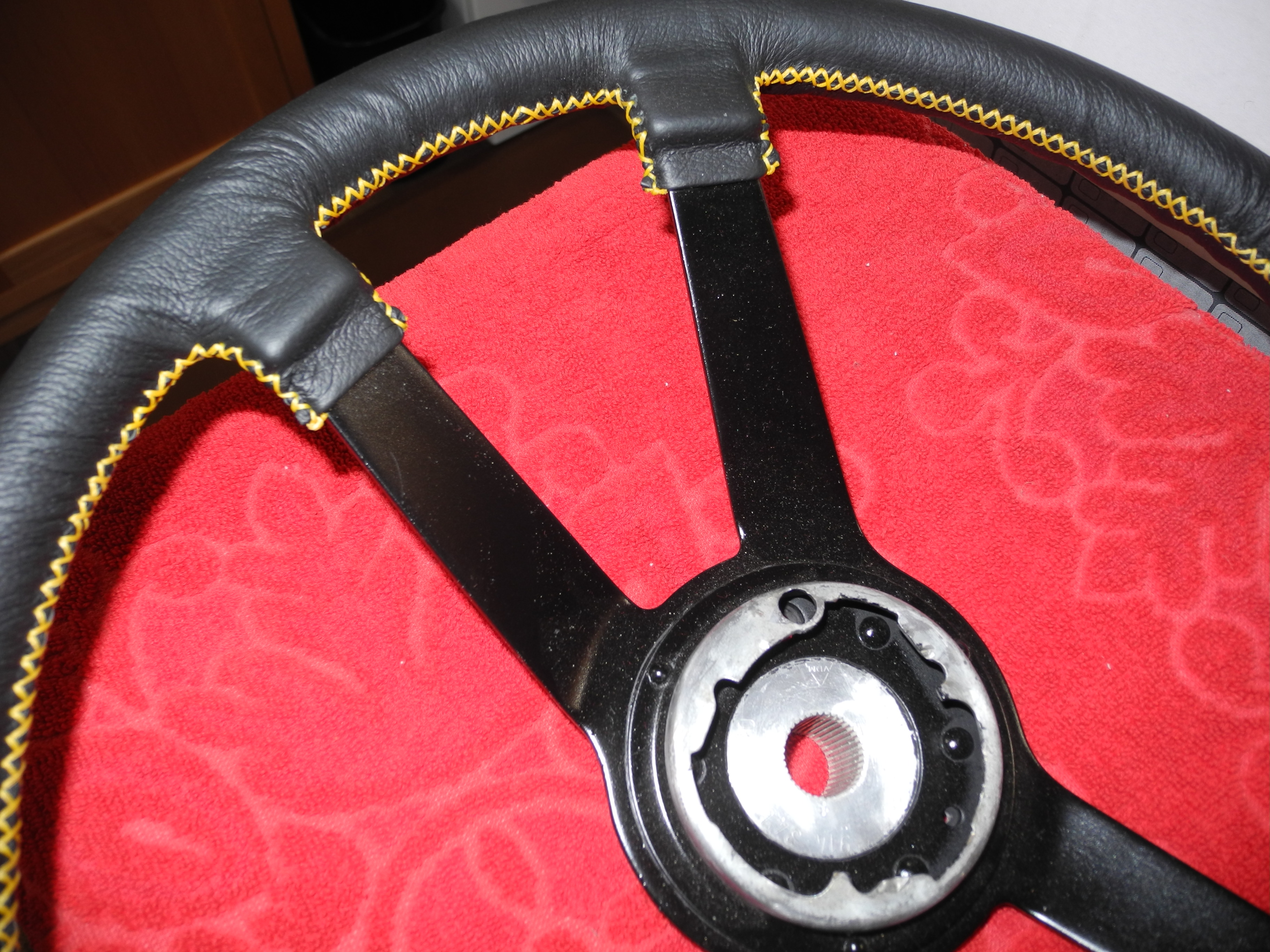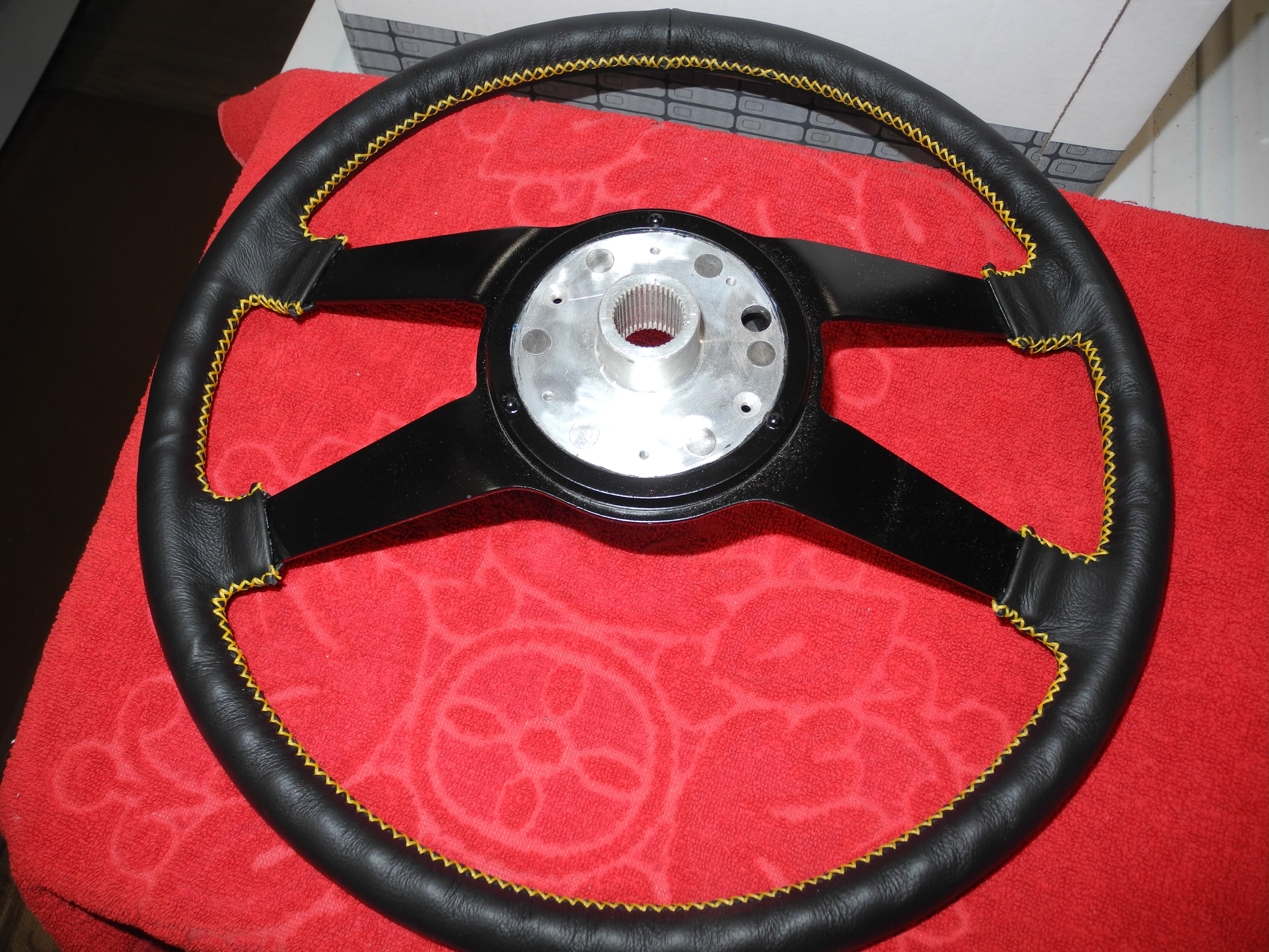 Just a regular hard rim 914 wheel. I recovered it in leather from Alan Gunn. With extra padding on this one. About 3 1/2 inches in circumference. This one has yellow stitching. Did it for my Bahama Yellow 912 but decided to go back to my original 400. Might not be for everyone but I thought a little accent might be nice. I think it came out great and feels good too. Paint on the spokes have been repainted and looks perfect. No horn pad or cancelling ring, you will have to use yours or source I will take your 380 or 400mm flat hub wheel as a core for $150 (you pay shipping). $750 shipped in the US (others we can discuss) Dean |