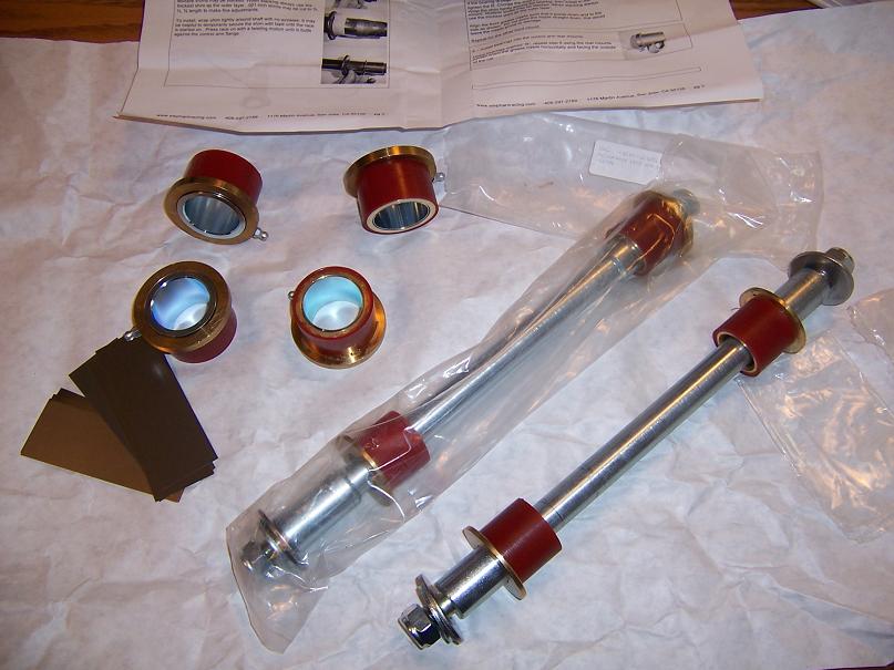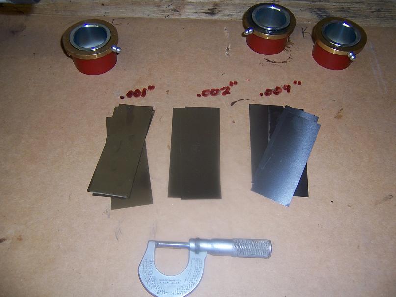 The PolyBronze Front Bushings come with 3 thicknesses of steel shim stock to be used to take up any play when fitting up the inner race sleeve on the control arm. .001" .002", .004"