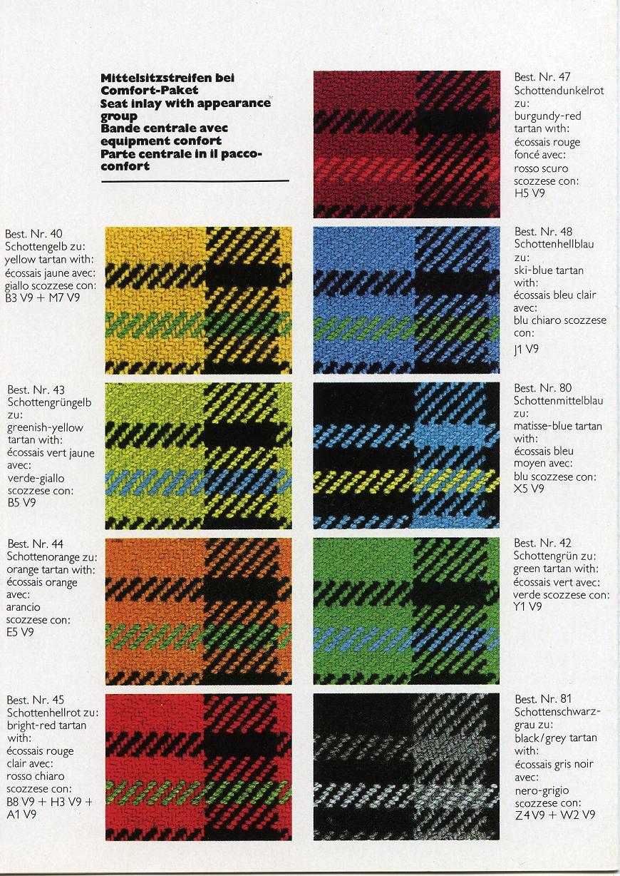 check out that various interiors were available with different exterior colours Note that for every paint code in 1975 they had matched a specific plaid to it. 45 A1 L041 Black 40 B3 L13K Sun / Sunflower Yellow 43 B5 L11D Berber Yellow 45 B8 L80E Light Ivory 44 E5 L20C Nepal Orange 45 H3 L31M Scarlet / Ibiza Red 47 H5 L30C Malaga Red 48 J1 L50C Laguna / Lagoon Blue 40 M7 L64K Zambezi / Forest Green 81 W2 L99K Metallic Copper 80 X5 L97B Metallic Ancona Blue 42 Y1 L95K Metallic Palma Green 81 Z4 L97A Metallic Diamond Silver |