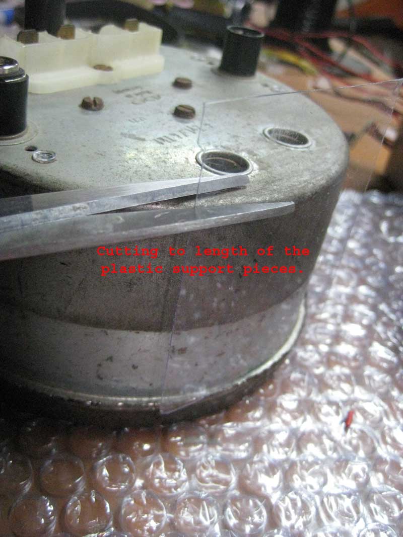 Cut the clear packing plastic into small rectangular strips roughly 3”x2”. Fit to the empty gauge housing and cut to length. Notch one end of the plastic strip to support EL wire. Set aside plastic supports. Attached thumbnail(s) Attached image(s)