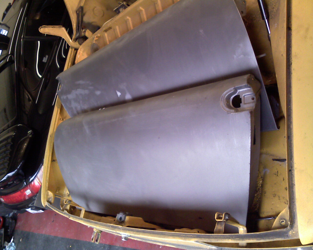 Quick update, its a 75 L13 (Summer yellow) 1.8L and has had a few paint jobs (terrible ones) over its life. I found a media blaster here locally (finally) and I have to admit, I LOVE soda blasting. Makes 35 year old metal look like brand new (other than damaged areas). Was considering sand before finding this guy, but he has convinced me. So far he's done the doors, deck lid and hood (threw my 993 track rims in there since they were looking ratty too (IMG:style_emoticons/default/smile.gif) ). Next week, his rotisserie is supposed to be available, so we'll load it up, he'll blast it down to metal (may sand blast the floors to get the nasty rust off and see whats left) and he's going to let me have the rotis for 1 month to give me time to replace the pans etc.... Now the questions Who really has the best price and product when it comes to the replacement metal? I know Auto Atl and Resto Design have them and there seems to be a decent price difference. I know a good many of you have experience with both and since I have none with either, I'd like to rely on what you guys have to say. I'm going to need pans, inner lower firewall, engine tray (holds the engine rubber) under the battery tray, and maybe a couple other small metal bits. I'll need this stuff pretty quick if I don't want to pay for the rotis after a month, so who can I rely on? I'll be posting pics soon for a complete diary of the restoration. Hope I can live up to some of the amazing work I've seen here. I plan to do the pans etc myself, but there is rust in tight spots (underside of doors and small area on the rear decklid) that I don't have the talent for. The blaster was a Mercedes body man for many years and I'll defer that intricate work to him. This is going to get expensive, I can already tell (IMG:style_emoticons/default/smile.gif) Oh as a bench mark, he said its going to run between 12-1400 to do the entire car. Sounded high but what are my alternatives .....? It is pretty work though, and I think is the right thing to do TIA |