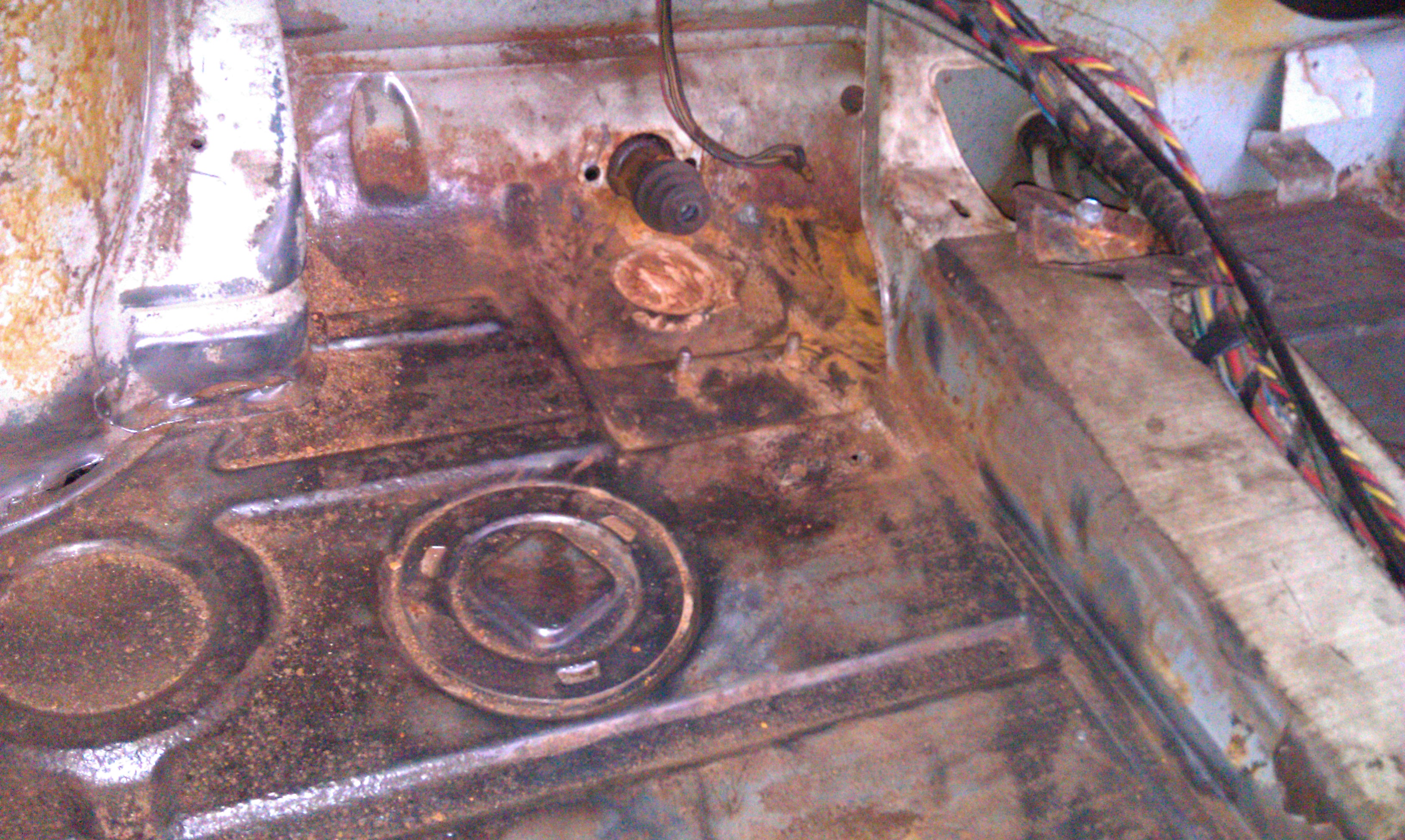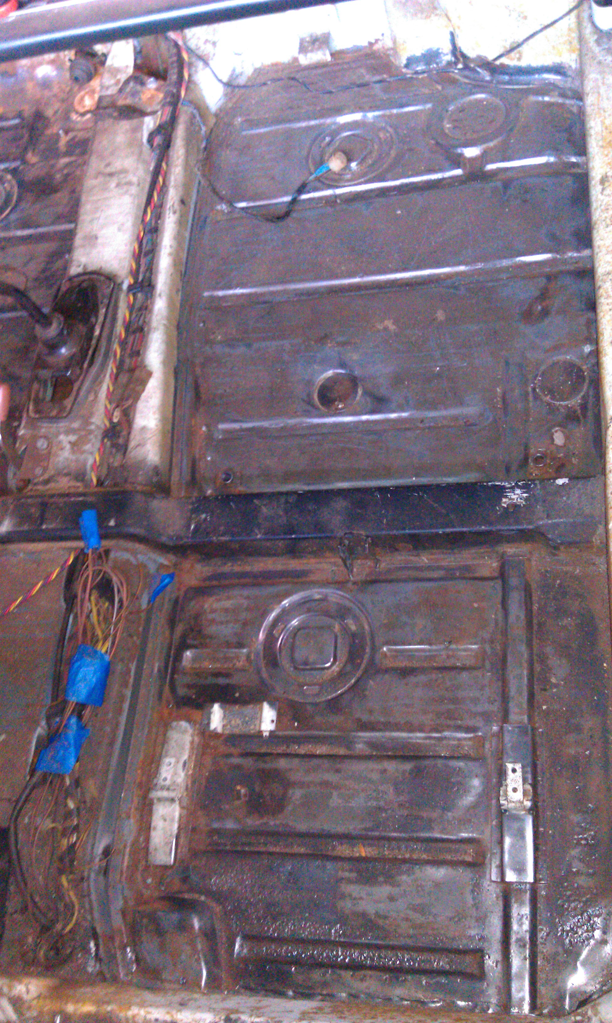 A little history: I bought the 1975 2.0 in 1988 as my daily driver. Drove it like I stole it (IMG:style_emoticons/default/driving.gif) for a few years until I could hear the rods starting to loosen up. Started pricing stock rebuilds and was trying to figure out how to make that work on my late 20's single guy budget. I read an article about Renegade in VW/Porsche and realized that I drove within a mile of their Santa Fe Springs shop every day on my commute. I stopped in and went for a ride in their 500hp shop car. I got back in my car and floored it on the way up the freeway on ramp. Right then, my car's fate was sealed. I scraped together the cash for their basic conversion kit with cooling (nothing like the product that they sell now). Three years went by and I was able to make the car barely operational, but my fabrication skills weren't up to snuff and I started spending my time screwing around with electric car conversions (including a 914 conversion). Fast forward to 2004. I'm now married and have a better job. The wife suggests that I need to "make it go or make it gone." It makes sense. I send the car to Renegade's new shop in Las Vegas (new owners too). The old cooling system has rotted away in the mean time and the new system is much more effective. I go with their new cooling system, their trans, new adapter and clutch package, build a new 327 with aluminum heads, a 911 front end, convert to 5 lug rears, get a set of 6x15 fuchs, etc. etc. The car comes back in a month and costs a small fortune. The car drives great, but I immediately start thinking about what's next. The gearing is great, but as a 4 speed, it always feels like it needs one more gear for freeway cruising. I eventually find a 915 gearbox with 3:10 R&P. I had it flipped with new gears, reinforcements and LSD. The new box has the same gearing in the first 4 gears as the Renegade box with an extra overdrive that drop the 70mph rpm to about 2100. I keep an eye out for other deals and find a set of steel flares (probably from the original group buy), a set of 7" and 9" Fuchs 16's, MAF fuel injection for the V8 and a bunch of other small parts. The pile of "upgrades" slowly grows over the years. Fast forward to 2011. At some point, I need to empty the 16' box trailer in the driveway to move my 1916 Model T. I haul out an amazing hoard of 914 goodies. Why is all this stuff in a trailer and not in the 914? I need to get off my butt again... Last week I delivered the car to Sean at SD Autosports in San Diego. There's been a few leaks in the last couple of years and I infested rust into a relatively rust free car (IMG:style_emoticons/default/slap.gif) . The pics are: under the driver's seat, under the passenger seat, and the same area before removing the tar. I thought that the passenger side looked OK, but it appears much worse once the tar was removed. It's actually not as bad as it looks, wirebrushing, rust treatment and new paint and that area will be good to go. The driver's side might need some new metal... Attached image(s)