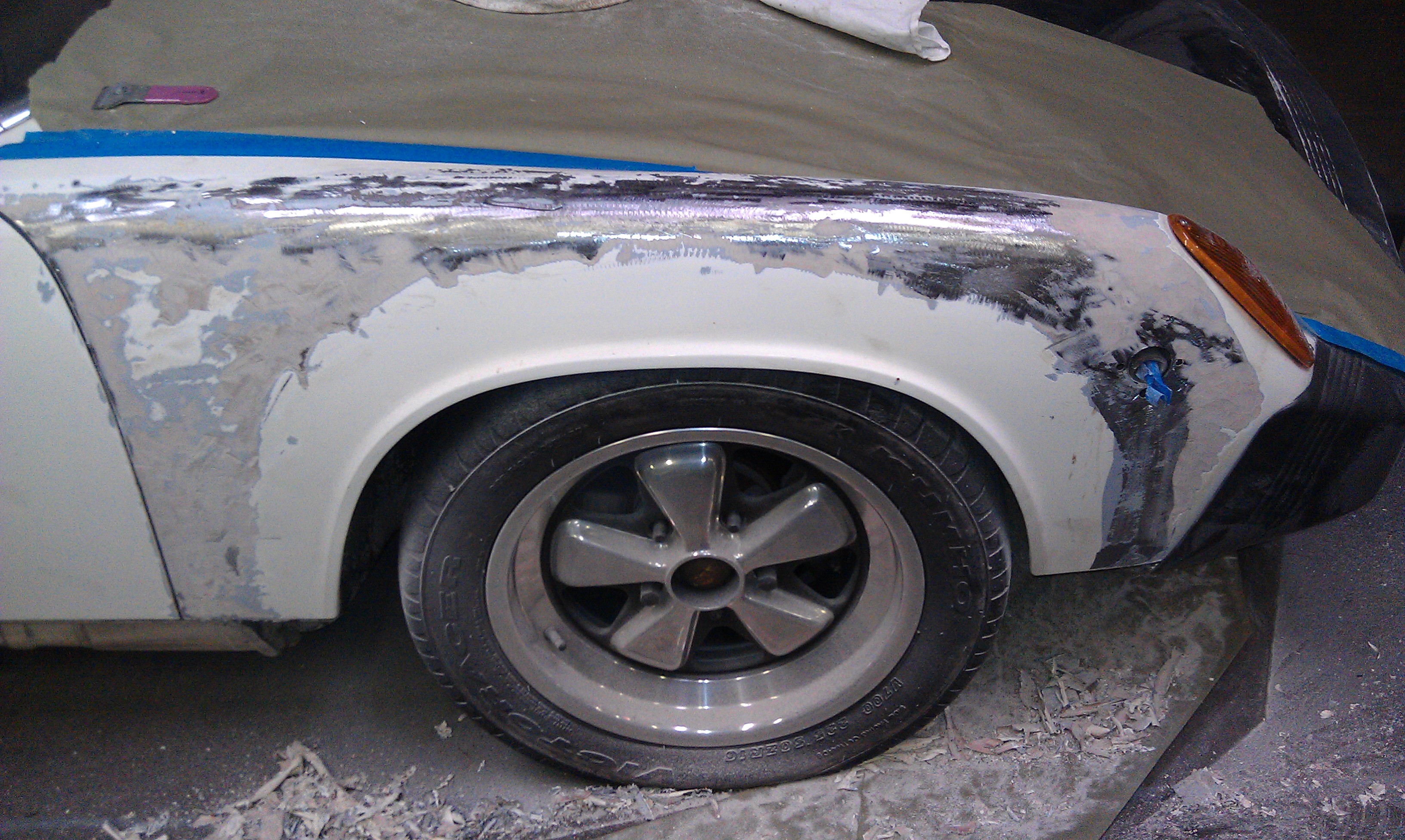 So my car is finally going back under the knife. A little history: I bought the 1975 2.0 in 1988 as my daily driver. Drove it like I stole it (IMG:style_emoticons/default/driving.gif) for a few years until I could hear the rods starting to loosen up. Started pricing stock rebuilds and was trying to figure out how to make that work on my late 20's single guy budget. I read an article about Renegade in VW/Porsche and realized that I drove within a mile of their Santa Fe Springs shop every day on my commute. I stopped in and went for a ride in their 500hp shop car. I got back in my car and floored it on the way up the freeway on ramp. Right then, my car's fate was sealed. I scraped together the cash for their basic conversion kit with cooling (nothing like the product that they sell now). Three years went by and I was able to make the car barely operational, but my fabrication skills weren't up to snuff and I started spending my time screwing around with electric car conversions (including a 914 conversion). Fast forward to 2004. I'm now married and have a better job. The wife suggests that I need to "make it go or make it gone." It makes sense. I send the car to Renegade's new shop in Las Vegas (new owners too). The old cooling system has rotted away in the mean time and the new system is much more effective. I go with their new cooling system, their trans, new adapter and clutch package, build a new 327 with aluminum heads, a 911 front end, convert to 5 lug rears, get a set of 6x15 fuchs, etc. etc. The car comes back in a month and costs a small fortune. The car drives great, but I immediately start thinking about what's next. The gearing is great, but as a 4 speed, it always feels like it needs one more gear for freeway cruising. I eventually find a 915 gearbox with 3:10 R&P. I had it flipped with new gears, reinforcements and LSD. The new box has the same gearing in the first 4 gears as the Renegade box with an extra overdrive that drop the 70mph rpm to about 2100. I keep an eye out for other deals and find a set of steel flares (probably from the original group buy), a set of 7" and 9" Fuchs 16's, MAF fuel injection for the V8 and a bunch of other small parts. The pile of "upgrades" slowly grows over the years. Fast forward to 2011. At some point, I need to empty the 16' box trailer in the driveway to move my 1916 Model T. I haul out an amazing hoard of 914 goodies. Why is all this stuff in a trailer and not in the 914? I need to get off my butt again... Last week I delivered the car to Sean at SD Autosports in San Diego. There's been a few leaks in the last couple of years and I infested rust into a relatively rust free car (IMG:style_emoticons/default/slap.gif) . The pics are: under the driver's seat, under the passenger seat, and the same area before removing the tar. I thought that the passenger side looked OK, but it appears much worse once the tar was removed. It's actually not as bad as it looks, wirebrushing, rust treatment and new paint and that area will be good to go. The driver's side might need some new metal... Sounds like you are doing everything first class. Where did you find the 915 trans witha 3:10 r/p and which letter gears did you end up using in the tranny? |