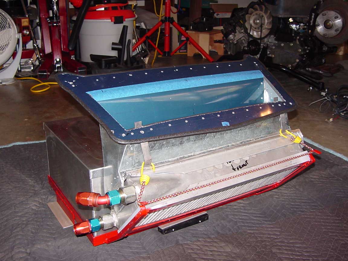Mine is a 15 gallon cell and, with this large oil cooler there it wouldn't fit into the front compartment. So I had to cut a slot into the middle bulkhead for the top edge of the cell to slip underneath. There is a single frame (red in these pictures) for both the cell and the oil cooler with the same criteria you had about getting them out in a hurry. The frame and lower ducting is riveted into the trunk but everything above that is removable in a hurry. I have to remove the exit duct with two screws and two toggles. Then unbolt two bolts to remove the front strap and the cell out slips out forward... takes 8 minutes max and I don't have to remove the oil cooler. The cell is held in with a tab at the back edge and a strap across the front that's bolted onto the divider found in late cars. I think these pix tell the story. The last pic shows the driver's side of the front strap and both the cooler duct fasteners on that side as well. Good luck! That is a very slick setup Ron! It is easy to forget that things have to be serviced and do something that makes it really hard. John |