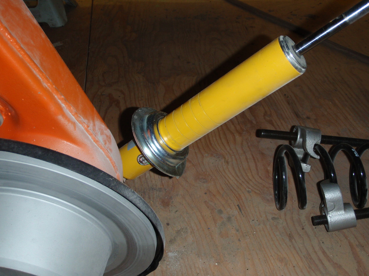 Installing new Bilstein shocks with 140 lb springs. took off stock springs with Koni's with a spring compressor. I didn't really need the spring compressors for the Bilstein's and now they slip off the bottom cradle. The Bilstein cradle is flat where the Koni's is more formed, like the top piece from the car.