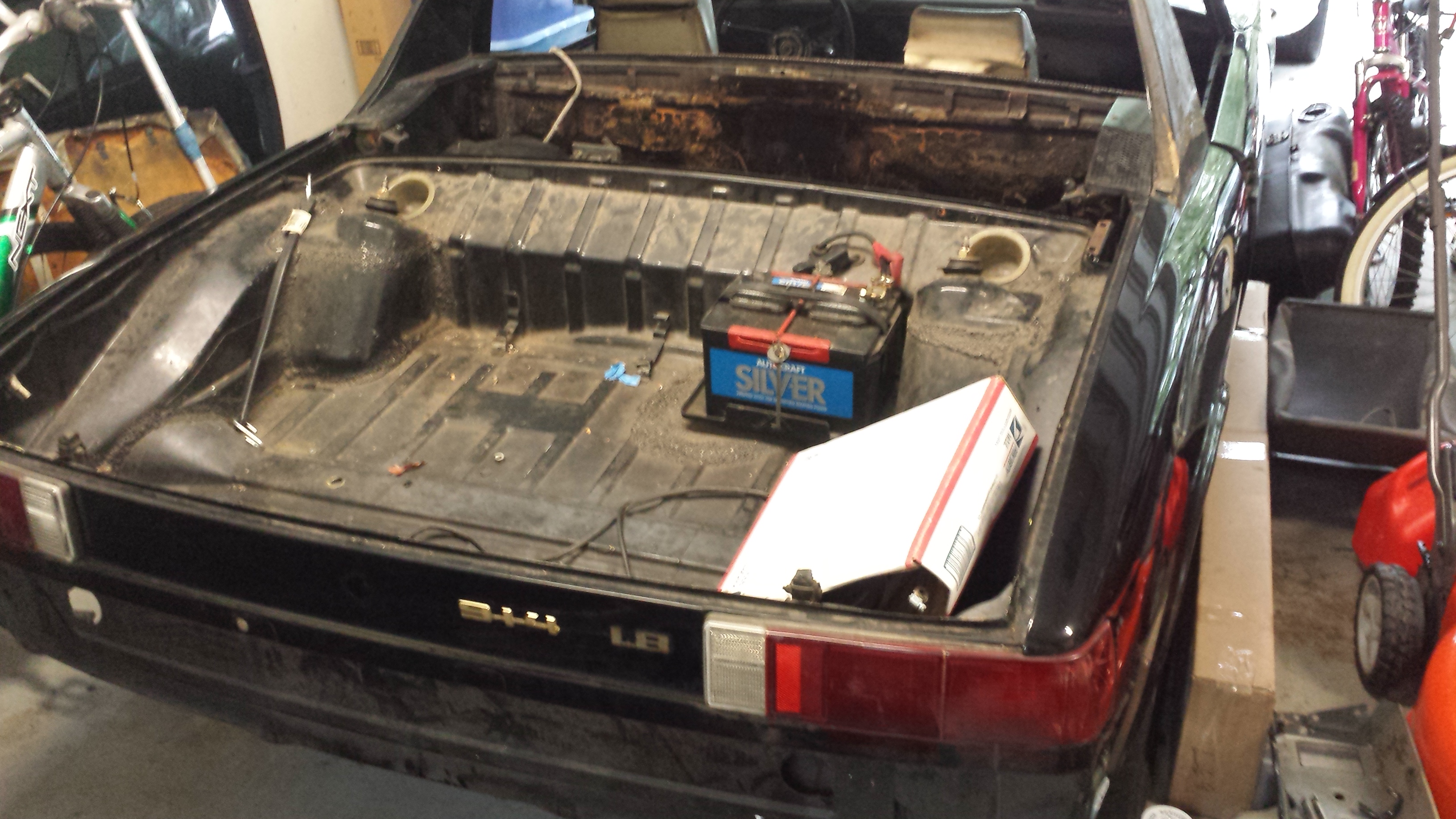 Back story: Not much is kknown about this car. I bought the car from Billh1963 on Sept. 29, 2015. He bought the car earlier in the year , found on Craigs list in Columbia, SC. We all know Bill can't pass up a deal!. Car sat for 10 years after the p.o. had pulled it off the road to fix and restore it. He got as far as stripping it down, pulled out much of the wiring harness. Replaced the right front quarter panel and then it was abandoned. Luckily it was preserved by being stored in a clean dry place. Goals: return to road as a nice close to original daily driver. 1. Remove rust in hell hole and passenger cross member, and sail panel area on left side. 2. Prepare for back dating bumpers 3. Clean and prep for repainting. 3.5. Assess motor status and prepare for refresh. Either a. Refresh 1.8 , b.rebuild using current motor with turbo, or c. Replace with 2.0 from donor car. 4. Paint 5. Reassemble and complete restore of interior. Interior was originally white, now dyed black and in bad shape. Not salvageable. Here are a few pictures of the current condition of the car. I am a late entry and thank the powers that be for allowing me to join the contest. I do not have the welding or body work talent that some have but I will do most if not all mechanical and interior restore work. Attached thumbnail(s) |