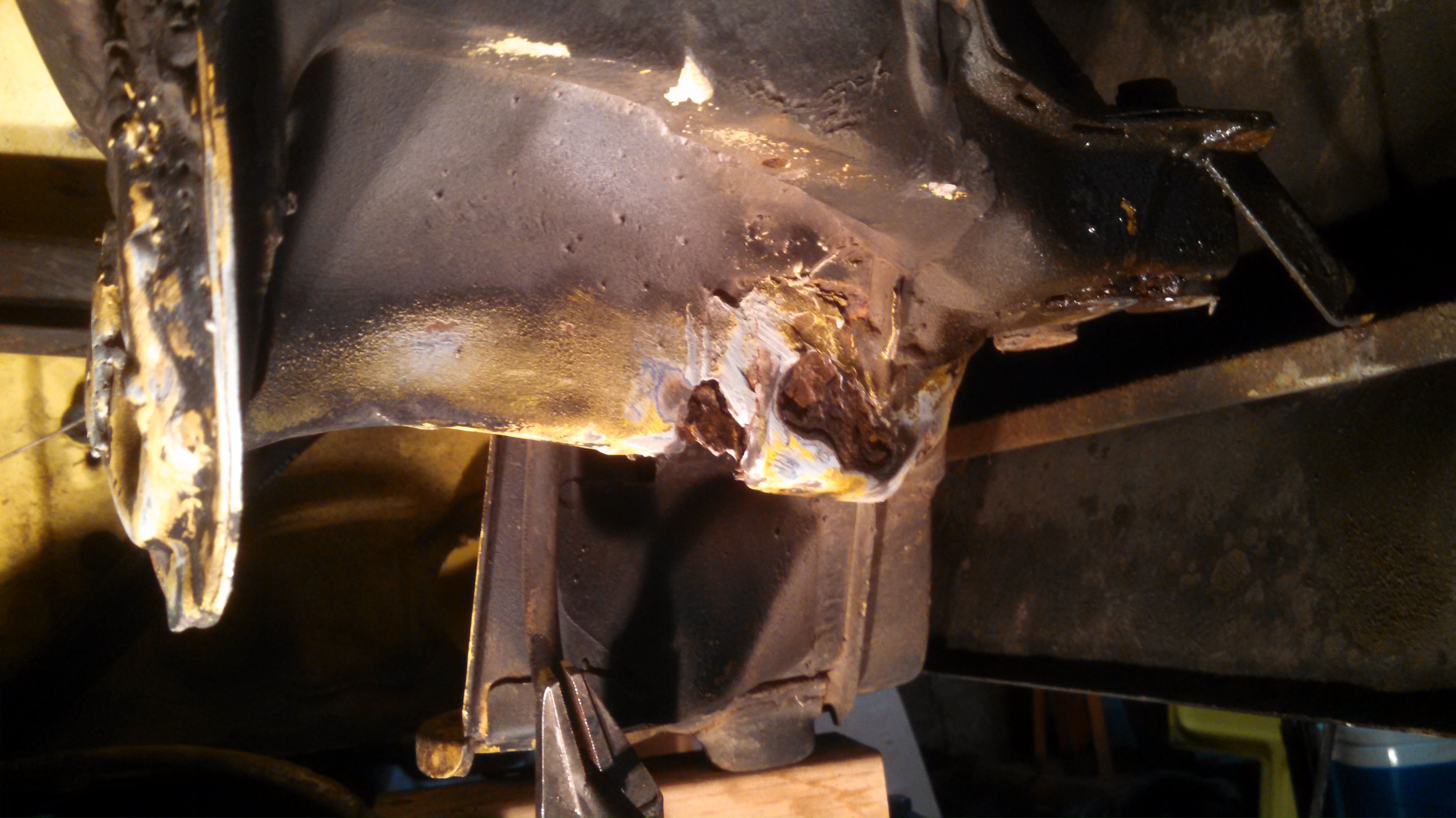 As is normally the case you have more issues lurking. Check out the inside of the chassis motor bar mount. It also looks like the bottom of that area has been patched. (IMG:style_emoticons/default/sad.gif) It appears that the last restoration did the repair and replace on the top, but thought that a little surface rust on the inside of the suspension console was not an issue. Now many years later, we know what happened. |