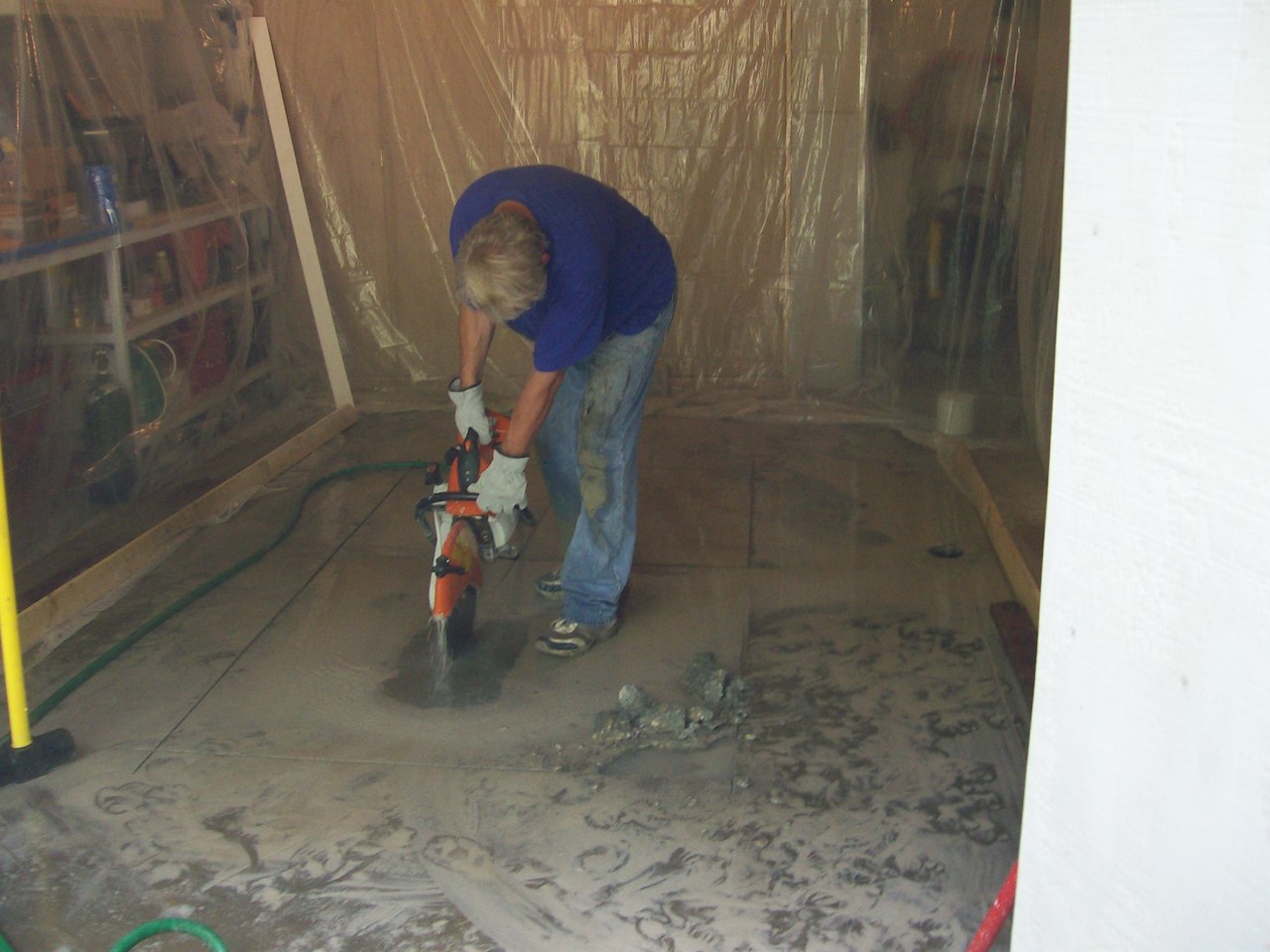 Harpo, I did have a friend to help....but the process went like this. Rent cement saw( the one I got was new with new blade) it cut the 6 bag mix almost as fast as cutting wood, could not believe. Then dug the sand out, down about 16 inches. The cement pour is a two step process, first pour base making sure it is level (my floor has a pitch to the floor drain). Then next morning framed up sides with a little rebar into the base. Second pour. Done.