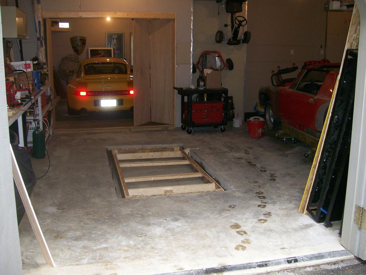 The old cement floor was only 3 1/2 inches thick with fiberglass imbedded, the new slab was 6 inches with a little rebar. Yes, sorry Justin, off the tracks we went.......mark PS with the scissor lift being lower in the floor, I can use the truck extensions for the lift making it possible to replace exhaust systems on newer VW Bettles and Jettas......for the Porsche's no problems.