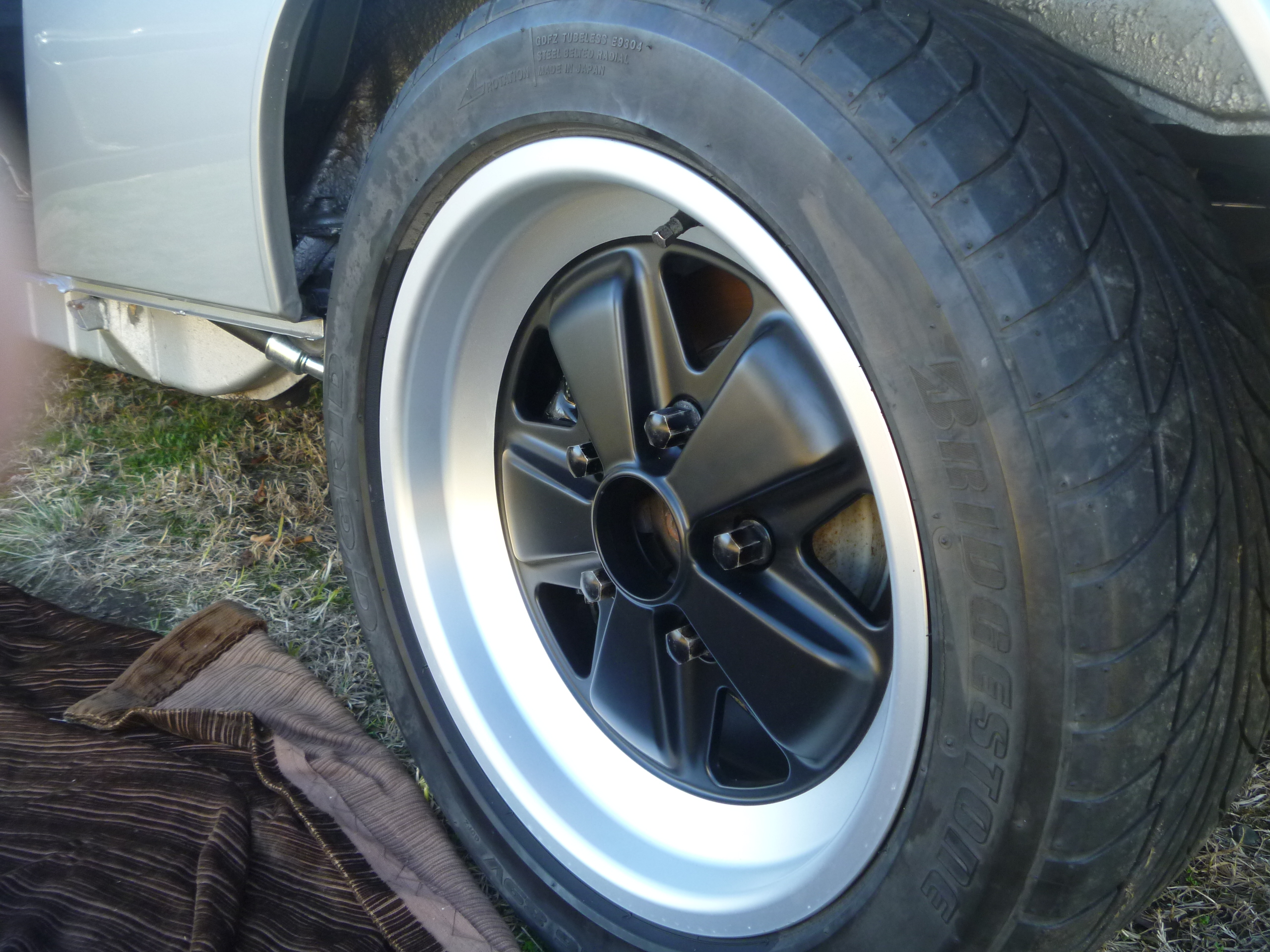 These are real deep sixes in RSR finish running 205/60 x 15 Yokohamas. Real Fuchs wheels are super light, very strong, and getting expensive. I prefer the look of 15s on our cars, but that is just personal preference. They look great IMHO, but some of the replicas on the market today are hard to distinguish from the real thing. |