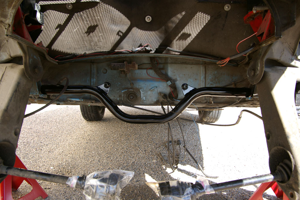 The picture is deceiving. It's not actually mounted in there yet. It's just sitting atop the original Porsche cross member mounting points. I plan to weld a pair of right angle tubes into a pair of tubes the next size smaller than the tube diameter of the new cross member and mount that atop the mounting flange of the original cross member (rather than below as most other cross member adapters do). But I still need to set the engine/trans up in the car to get the measurements as to exactly how tall the end pieces will need to be. But that has to wait on a thorough cleaning of the engine compartment. As you can see in the photo, it's pretty funky after 25 years. (IMG:http://www.914world.com/bbs2/html/emoticons/monkeydance.gif) |