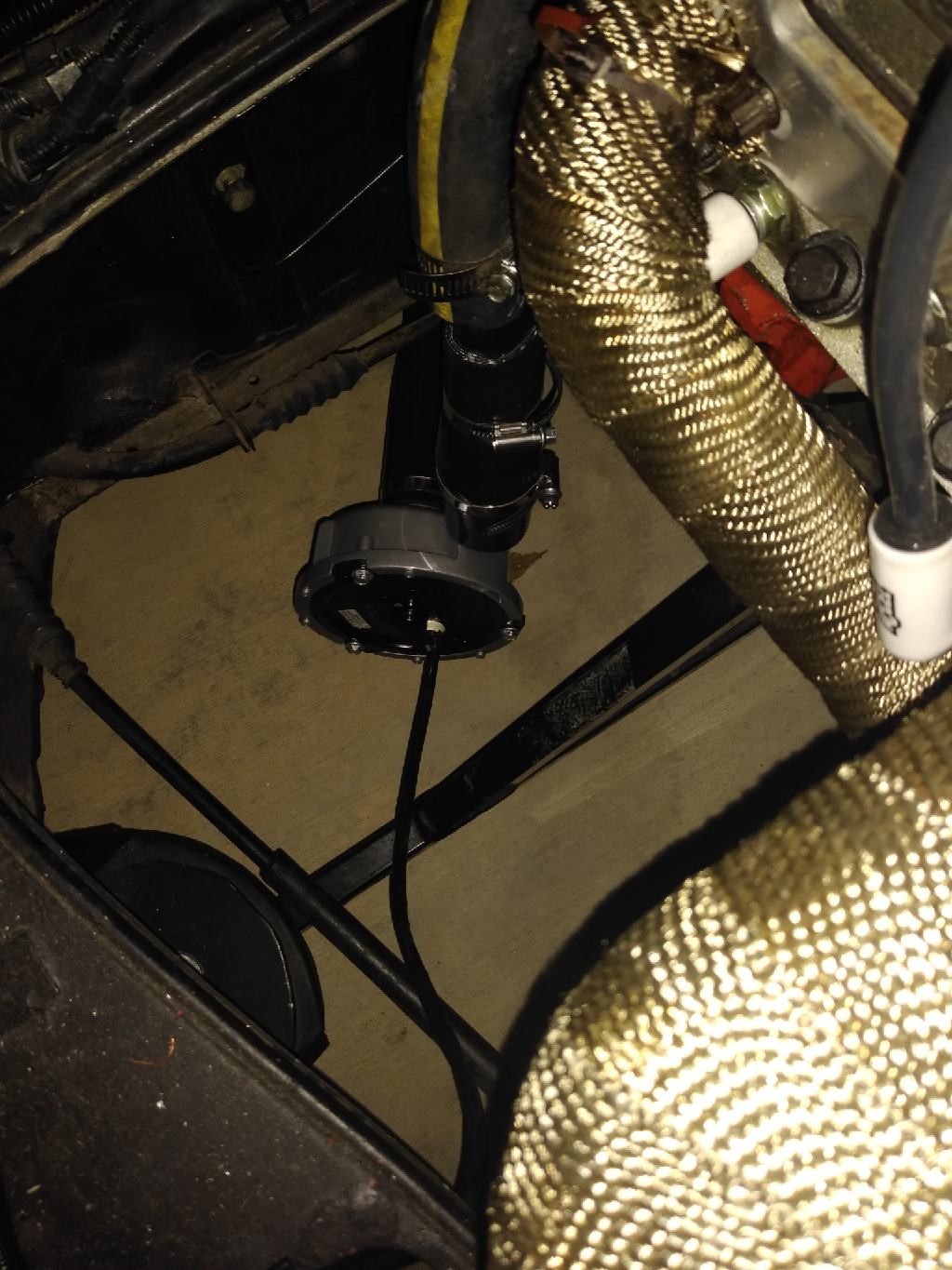 (Above) The small black box under the bass box houses my Arduino, a motor shield, and a few other components for the booster pump control. (Above) Wires for blower tucked up out of the way behind it. |