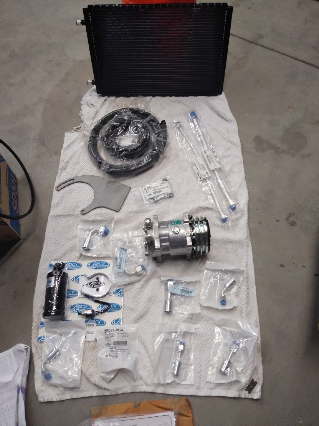 Heat worked great this winter and I got to drive a bunch more than last year. Finally got started on the air conditioning this weekend. These are some of the parts I have to work with: