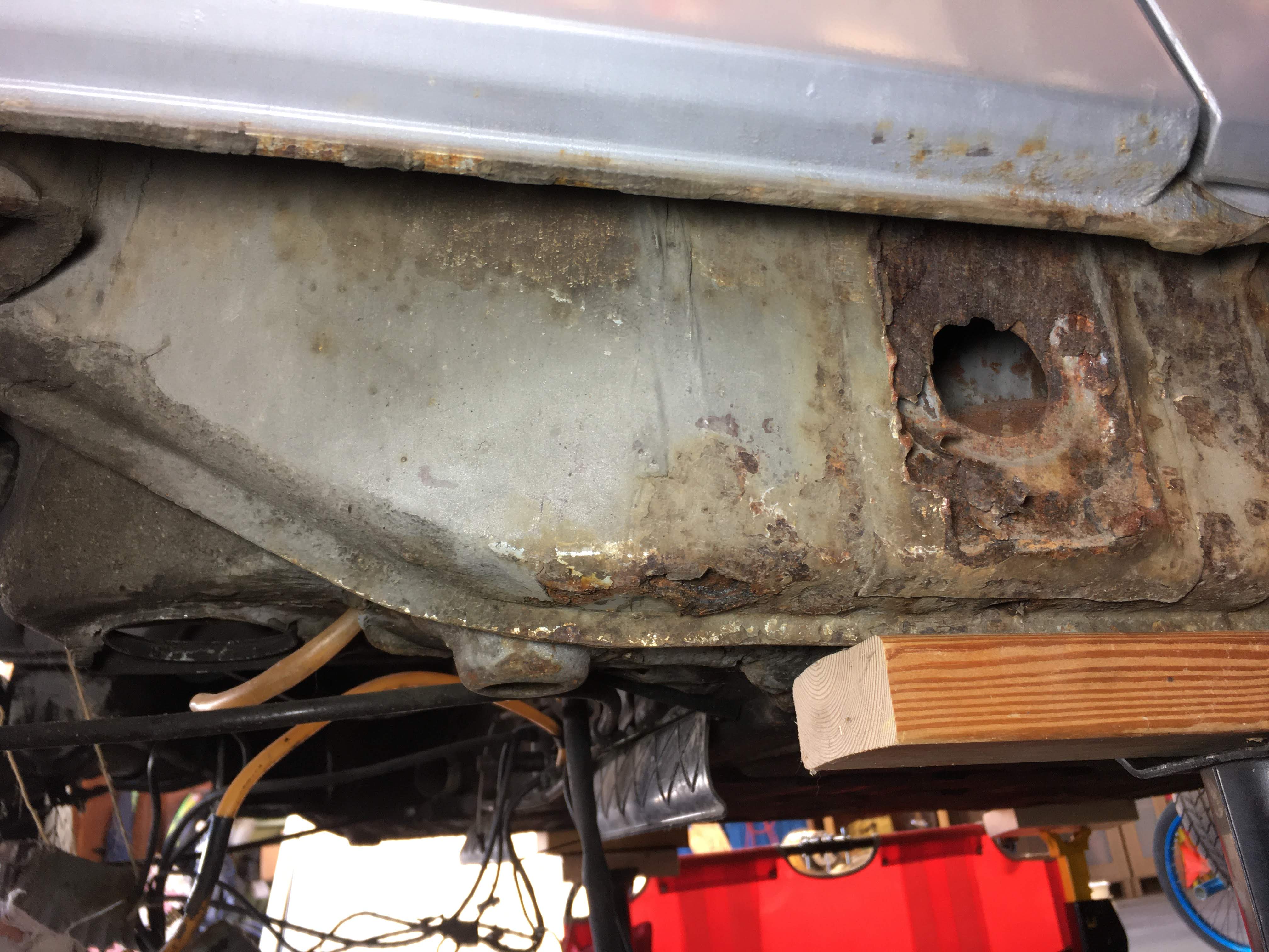 I think the first step should be making sure the chassis is still safe enough to drive before thinking about putting the engine back in. That means making sure your rear suspension points are still solid and there isn't any flex in the body. I'd go after the rusty spots on the longs with a screwdriver like I was trying to murder it to make sure you still have solid metal there. Somewhere there is a procedure for testing for flex but I couldn't find it. If it checks out solid enough, might as well drive and enjoy it. Warning: to drive it is to want it. (IMG:style_emoticons/default/rolleyes.gif) Honestly, what you've shown so far doesn't look to bad to me. Don't get me wrong, repairing just what we know is rotted is going to be a big project and there are probably more surprises inside, but it's doable. Fixing the engine shelf where the AC was is pretty easy. Restoration Design makes nice engine shelf replacements. Worst part will be fixing the rot under the battery because that will be a fabrication job. And, of course, whatever surprises are waiting for you inside. |