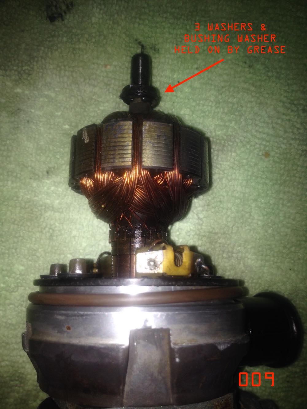 step 2 gets you to one of the internal leak failures. the big o-ring sealing the motor housing. i inspected this o-ring. it was hard on one side and had definitely been leaking. but there is one more seal to go. the electrical plug. Additionally at this point you can inspect the commutator and brushes on the electric motor. Mine were in good condition with reasonable level of wear. made sense. the car is a two owner car with 44 K miles and its been dormant for the last 16 years. the pump is worth saving assuming i can solve the leaks with new seals. Moving on. Electrical plug removal. at this point you have to get the lower part of the port/pump housing apart and detach the motor. first. there are two electrical connections rising from the plug to the brush holders. these wires are like springs at the brush ends. take a soldering iron and release the solder joints so they are free. next there are three spring washers which hold the pump/port housing together. work these off with a fine pick and a small fine screwdriver. finally drive out a very small pin which secures the motor axle to the top of the pump housing. you will need an ultra small pin punch, less than 2mm. or 1/16 in imperial size. be careful driving the pin out. i secured the axle in a vice with soft jaws and placed a rag below the vice to catch the pin. you do not want to lose this pin, its very very small. pull the motor out of the pump/port housing. carefully lift the internal face of the pump/port housing up threading the spring wires through it as you go. once apart stop there. you will be looking at the back of the electrical plug and if its a 009 pump it should look like the last image. there will be an earth wire, going to a stamped pin and the same stamped pin holds the sprung wire that connects to the brush holder on the motor section you have detached. to note. a 005 may not look like this. at some point i will know as i have a 005 to disassemble, but i have not done that yet. |