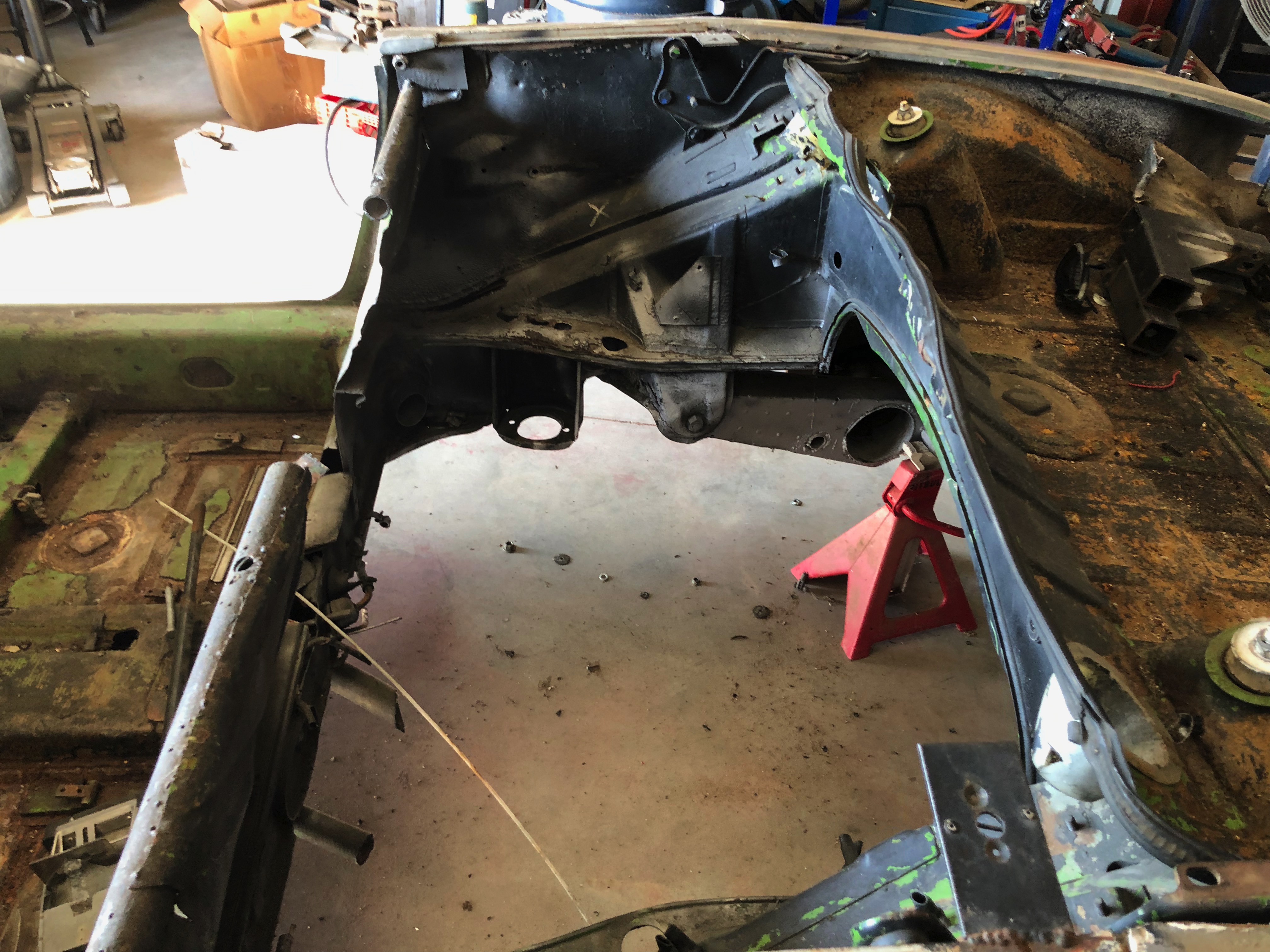 As alarming as those photos are, I respect this is your friends life long dream and you are helping him realize that. Whom ever butchered that chassis the way they did has no business even driving a car let alone working on one. Good luck as you make her sound and put her together for him. I look forward to watching. (IMG:style_emoticons/default/beerchug.gif) (IMG:style_emoticons/default/welcome.png)