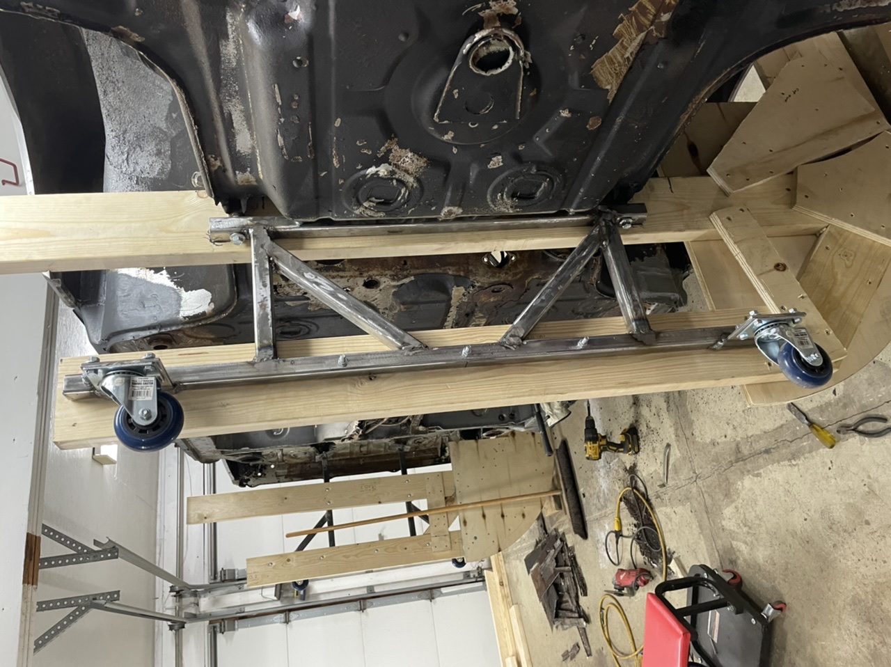 As mentioned I used the restoration design jig (they call it a Rotisserie) as a model. I just didn’t build 2 hoops as I didn’t want to spend money on all that extra steel and then cut it up after I was done with it. The rear is mounted to the trans mount exactly like the RD version and the front I modified to use a single cross brace and use the front suspension aux mount as part of their design. I think the way I did it is stronger plus I’m shipping that part (aux brace) off to be blasted. I spent about $110 on metal… $80 on wood, $20 on wheels and probably $15 on mounting bolts. It works but the metal jig is not perfect. I welded it together on a less the. Perfect table… but it’s strong and it works for this application. Also it was a cheap way to get the job done and something I felt was very secure to hold the car. The tub and what I have left in it weighs less the. 600lbs so it’s not really that heavy. I had my engineer nephew (he designs massive auto and train bridges) in go thru and calculate all the bolt loads in sheer and it’s not going to break there. As far as dipping the doors and hoods… I don’t think there is any glue left in there. I was thinking I would be adding in some panel glue on the hoods as the sheet metal has some oil can. Blasting has some issues too as I’m sure you are aware. I’ll discuss it again with the experts who have done this.. but I’m confident this is best and safe for these parts. I actually regret mentioning it. |