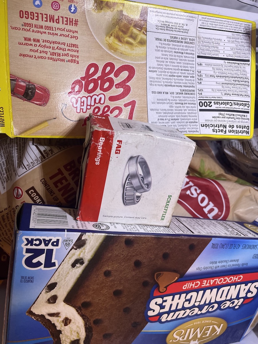 First order of business was removing the axle nut cotter pin... Then remove the brake disc and move the caliber out of the way... I proceeded to get the hub, bearing cover plate and wheel bearing removed in short order. Based on my investigation, the wheel bearing didn't look too bad. I knew, however, it had been a long time since they had been replaced so I planned on replacing both. (TEASER: when I removed the passenger side bearing last night it became evident immediately that this was the one making noise, but more on that later). After cleaning the hub a bit, and giving the bearing plate a refurb (In black opposed to gold...the horror) I scavenged in the freezer to find the last of my bearing stash that I put in there at least 18-months ago... I'll have you know, I did not grab an ice cream sandwich, even though I really wanted to. I proceeded to pop the new bearing in and install the bearing cover plate. ![]() |