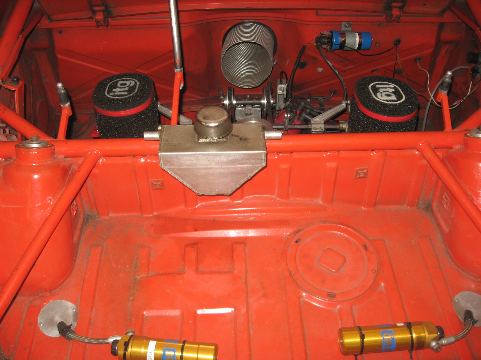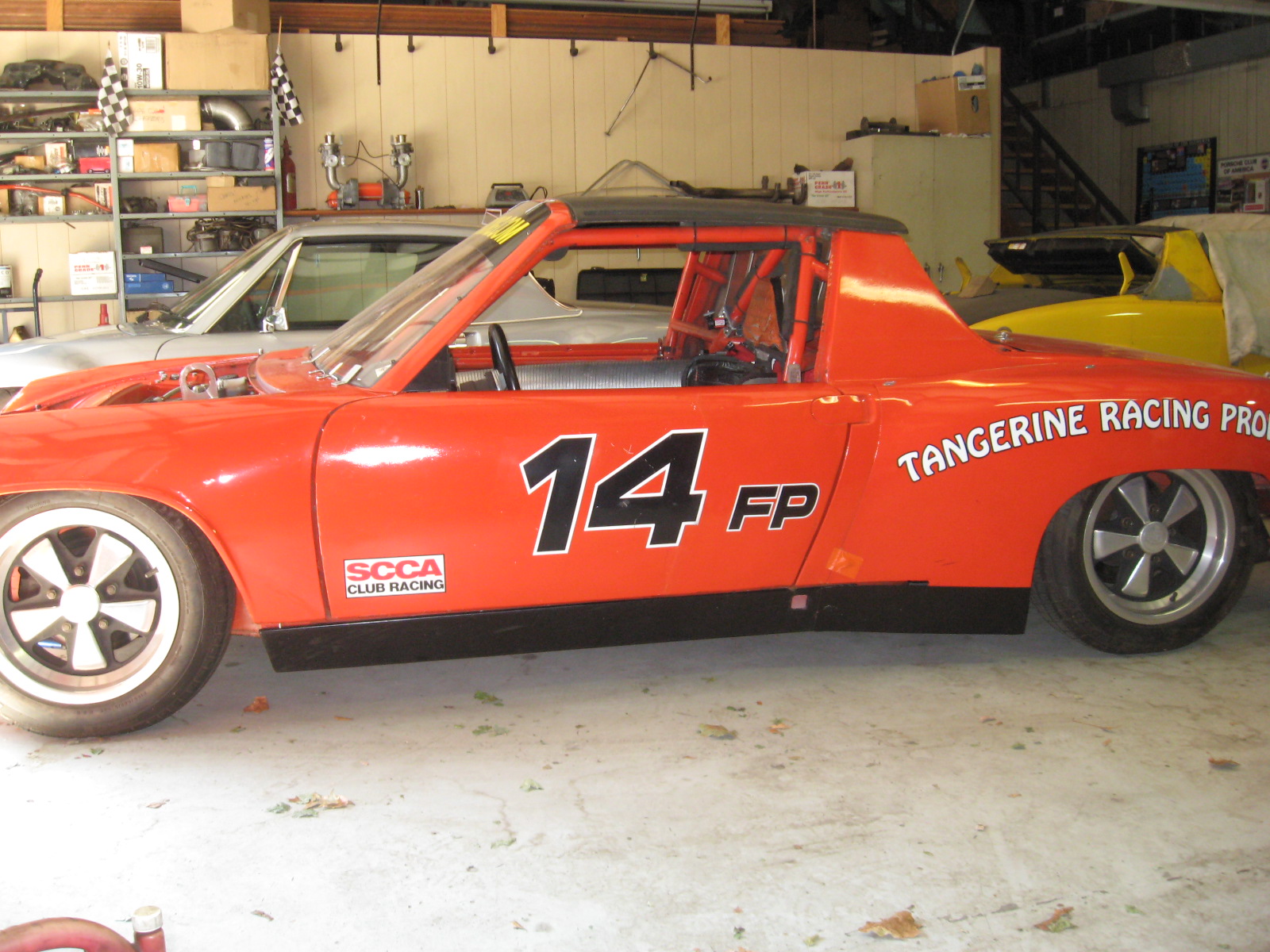 · Stripped & Painted 1970 914-4 · 8 Point Welded Roll Cage · Front Suspension Camber Boxes · Raised Rear Suspension Pickup Points (3”) · Raised Rear Shock Towers (1 ½”) · Custom 6 gallon fuel cell located in (altered) stock fuel compartment · 6” dia flexible tube installed for engine cooling air - from left fog light to engine comp. · Lexan Windshield; Lexan rear window · Removable Lexan side windows for open transport Suspension: · 935 Heim Joint Front A-Arms · 911 Struts with 22mm raised spindles · 300 lb springs on Front Coilovers · Custom Valved Front Bilstein Shock Inserts · Turbo Tie Rods · 1 ¼” Front Adjustable Anti-Sway Bar · 16mm Rear Adjustable Anti-Sway Bar · Custom Reinforced and Decambered Trailing Arms · Custom Ohlins 3 way rear adjustable remote canister shock & Custom shock mounting bolts · 225 lb Rear Springs on Threaded Perches · 2 Sets of 7 x 15 Keizer Wheels · 1 Set of 7 x 15 Cookie Cutter Wheels · Used Bias Ply Hoosier Cantilevered Slicks, R45 compound · Used Hoosier Wets Brakes: · Dual Tilton Master Cylinders with Cockpit Adjustable Bias Knob · 911M Front Calipers & vented rotors · Custom Modified 914-4 Rear Caliper & siolid rotors · KFP Magnum Brake Pads · Front Rotor Cooling Ducts from airdam to wheel hubs (custom hub inserts) Drivetrain · 930 Halfshafts · 911 Rear Hubs with 930 stub axles Bodywork: · Steel Front Flares · Fiberglass Removable Rear Flares · Carbon Fiber One Piece Bumper/Airdam mounted with Dzus Fasteners · Fiberglass Rear Bumper mounted with Dzus Fasteners · Gutted Stock Doors (on hinges) · Custom Racing Tow Loops on upper bodywork · Stock Roof Securely Bolted in place · Fiberglass Front and Rear Deck Lids held down with Hitch Pin Clips · Lightened Engine Lid mounted on Stock Hinges, held down with Hitch Pin Clip Interior · Battery in Marine container in passenger seat location · Original Keyed Ignition Switch on relocated stock column · 40 lbs ballast on passenger floor · 10 lb Halon fire suppression system with nozzles in passenger and engine compartments · Custom Aluminum Race Seat mounted to floor · LeCarra Quick Disconnect Steering Wheel · 4 panel rear view mirror/custom side mirror · Removable Window Net · Custom Gauge Panels Controls & Instrumentation · Rennshift Shift Lever · Custom Tilton Pedal for Brakes/ Stock Clutch & Throttle Pedals, footrest near clutch · VDO Tachometer · 4 channel scanning EGT gauge · 4 channel scanning CHT gauge · Amber alarm light for cooling system failure · Red Alarm light for oil pressure · VDO Oil Pressure and Oil Temperature gauges Engine Oiling System · Custom Dry Sump Oil Tank in Passenger Footwell (hidden behind panel) · Braided Aeroquip -12AN Oil Lines in Passenger Compartment · Front Trunk mounted oil coolers, Ducted thru fog light opening inlet; outlet behind airdam |