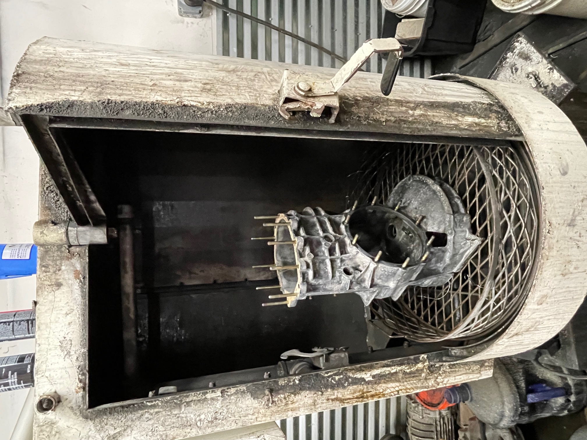 The trans had a lot of undercoating. That was the challenge. First the cuda parts washer, then the vapor hone machine, lots of water to rinse off the media, then a couple trips through the ultrasonic machine. The hot solution in the ultrasonic also helps to rapidly age the color of the mag back to grey.