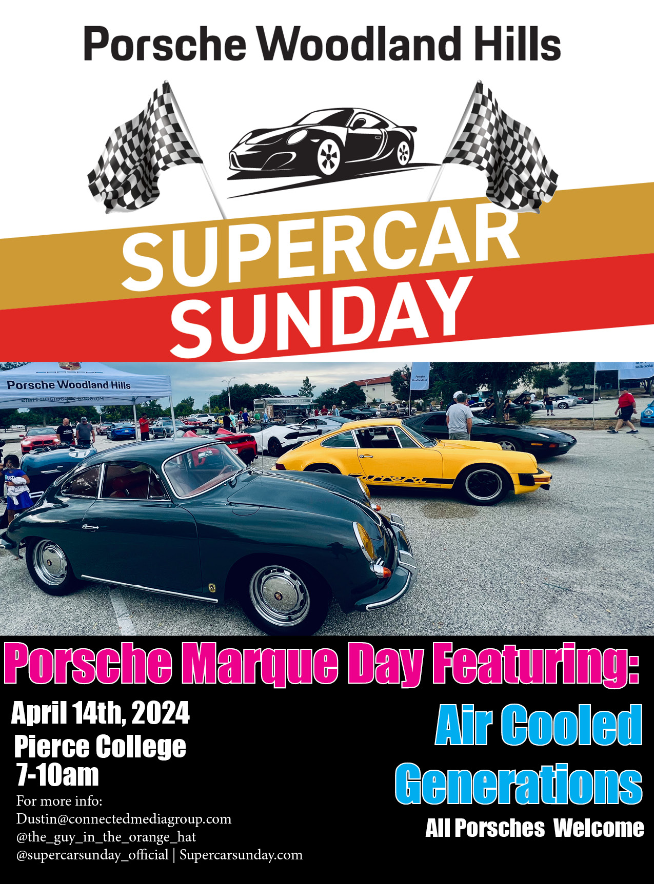We will have a Special Parking area for the Air Cooled Cars...within the Porsche Marque area! Join us for Porsche Marque Day April Edition! It is going to be epic! Supercar Sunday is presented and sponsored by Porsche Woodland Hills. We expect an incredible showing of Porsches as well as every other type of vehicle imaginable. There will be a VIP parking area for all Porsches. If you are attending please rsvp with Dustin and receive a complimentary $100.00 gift certificate to Lavaggio- The Art of Auto Detailing in Agoura Hills. RSVP: Dustin@connectedmediagroup.com Porsche Marque Day which has become one of the premier monthly Porsche events in Socal continues to amaze! From early air cooled cars to the latest models and modified Porsches and even track cars brought in on trailers... if you are a Porsche enthusiast, you cannot miss the Porsche Marque Days! Please use the Victory Blvd and Mason St. entrance for the show as the physical address takes you to the wrong side of the campus. We are in Parking Lot 7. See you at the show! Dustin Attached thumbnail(s) |
