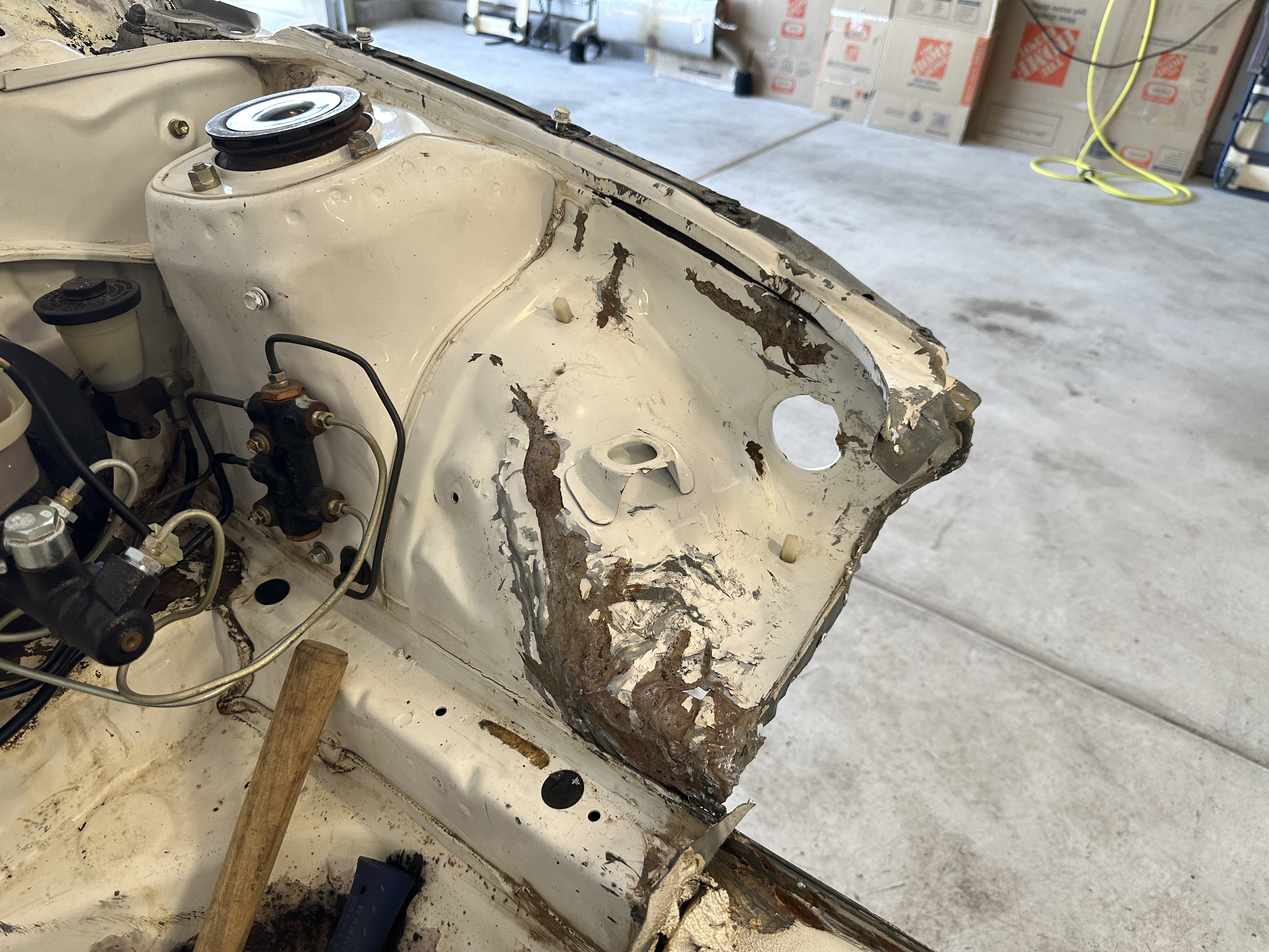 I had my own project, restoring some very bent sheet metal to a reasonable shape. This photo does not show the ugly details, but the forward part of the inner fender liner panel was crumpled, with a couple of tight folds of metal, and overall shortening of about 2 inches.