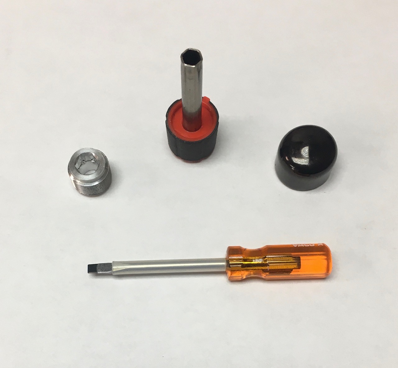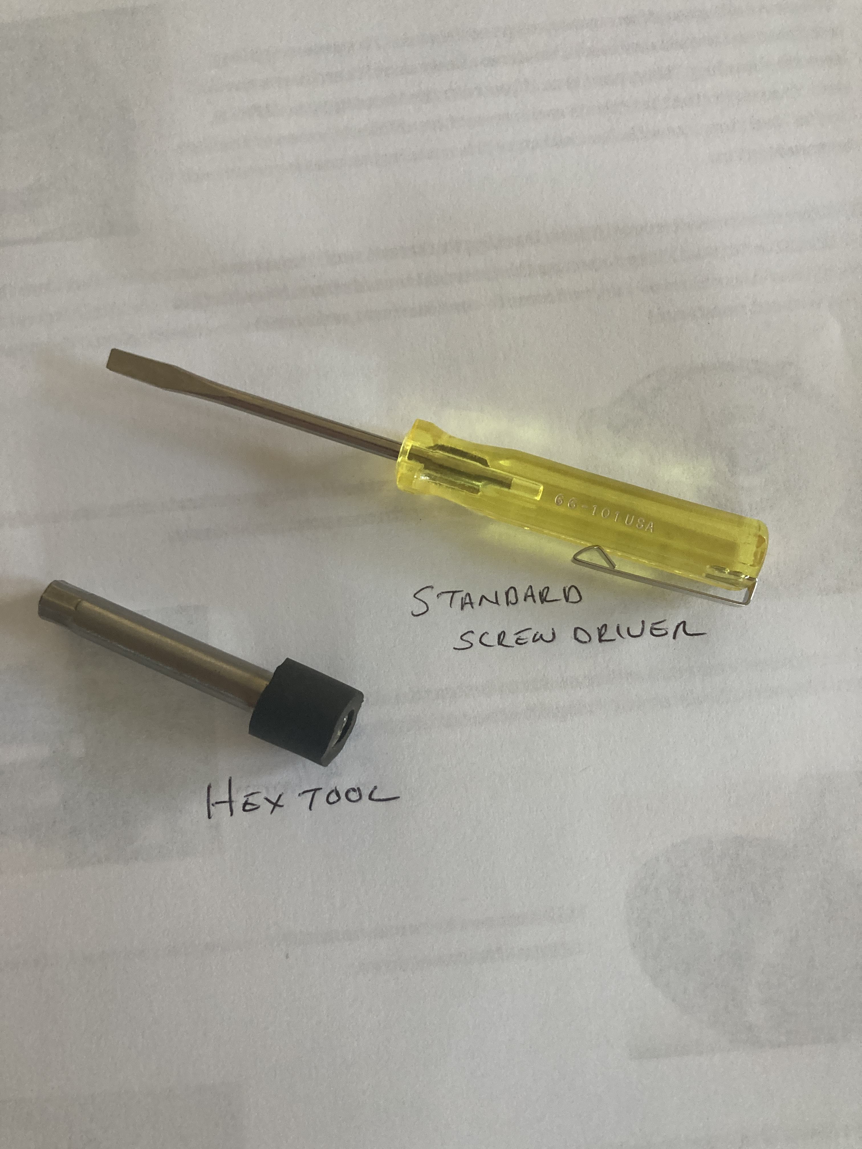 That's an old tool set pictured. Currently, I shorten the handle of the flat screwdriver so it will fit in the engine compartment better, and I sleeve the shank with hard plastic tubing to help keep it centered in the hex tool. The hex tool now has a nice knob on the end instead of a glued on piece of rubber tubing.