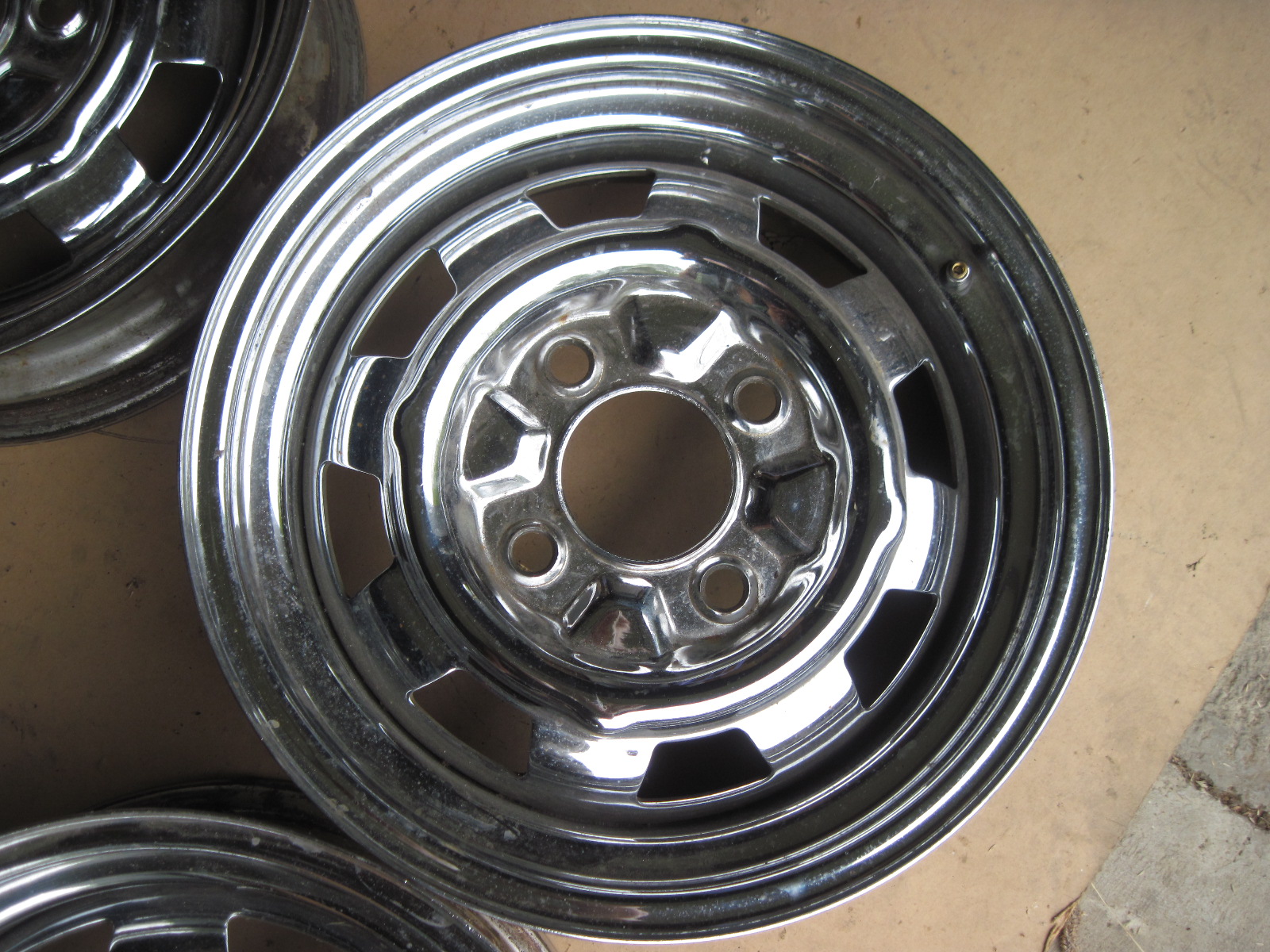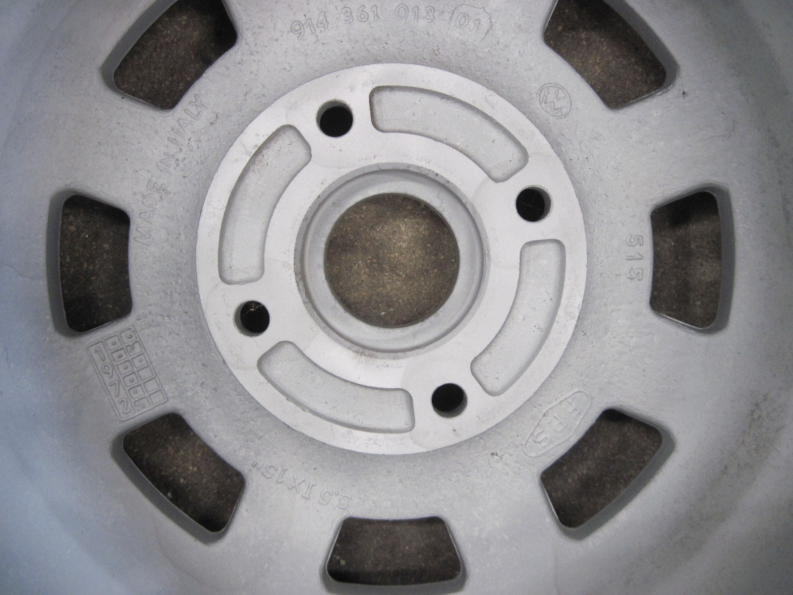 Stock Fuchs alloy wheel and original Dunlop tire. Definitely has a ding. Could be used as a spare tire (short distance on a 50+ year tire. $100 Predini original wheel, late style that can be used on any 914/4 hub. Refinished and absolutely straight. $125. Predini early original wheel. This is the early style which can only be used on 1970-1971 and early 1972 with original rotors. Absolutely straight, $100. I have 2 of these. 5.5X15 chrome wheels, nice condition for all 914/4. $125 set of 4. Plus shipping. Check or PayPal with a 4% add on. Attached thumbnail(s) |