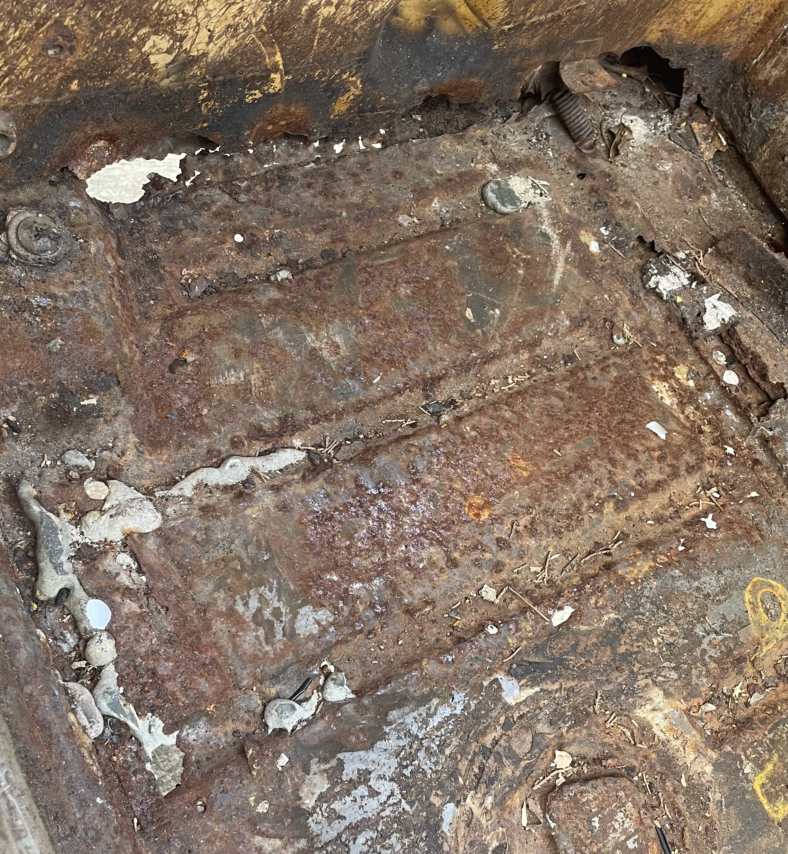The fiberglass cloth used on the back edge of the trunk floor apparently trapped water enough to create some rust thru areas. This will be repaired before the new trunk floor goes in: