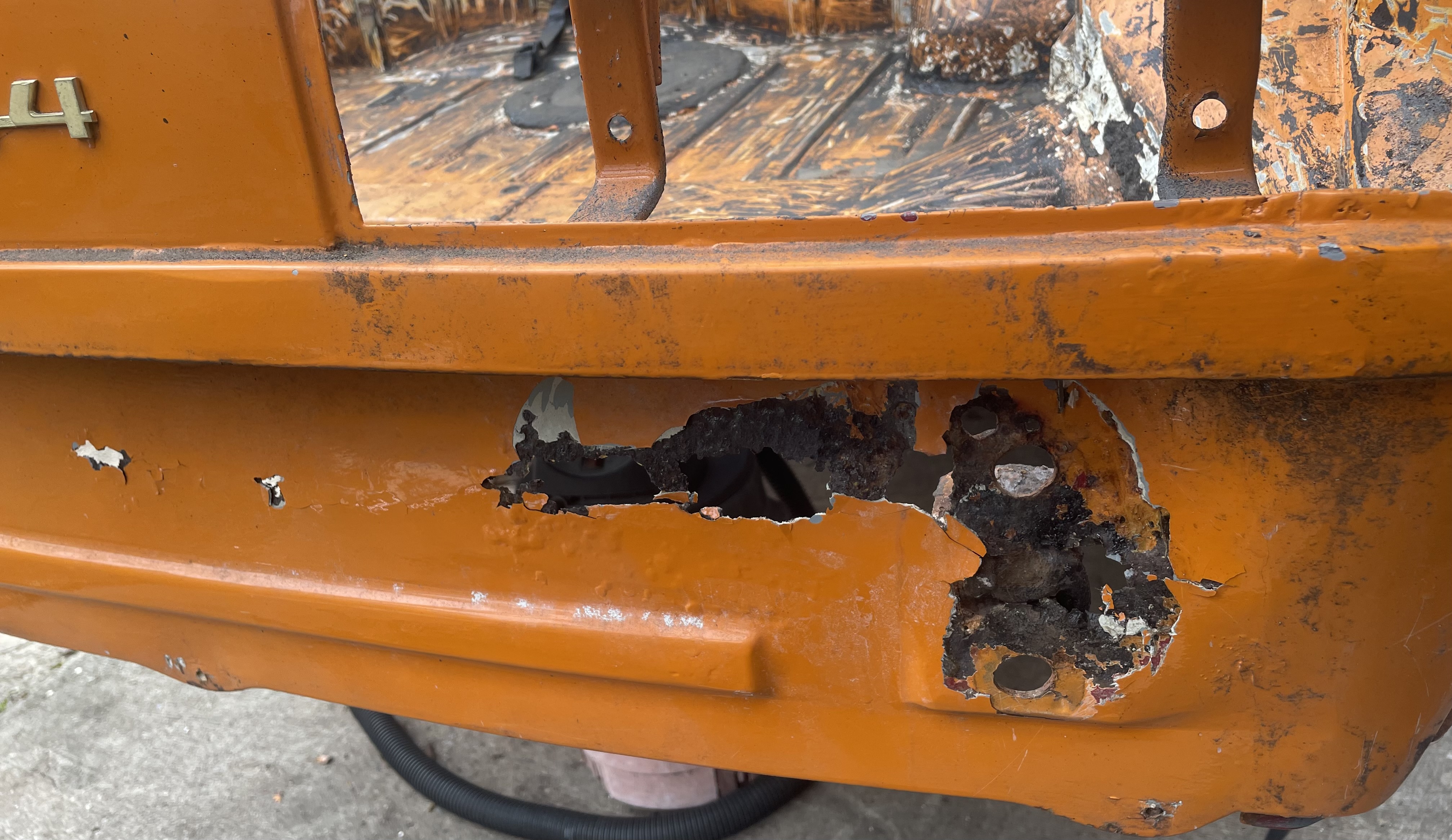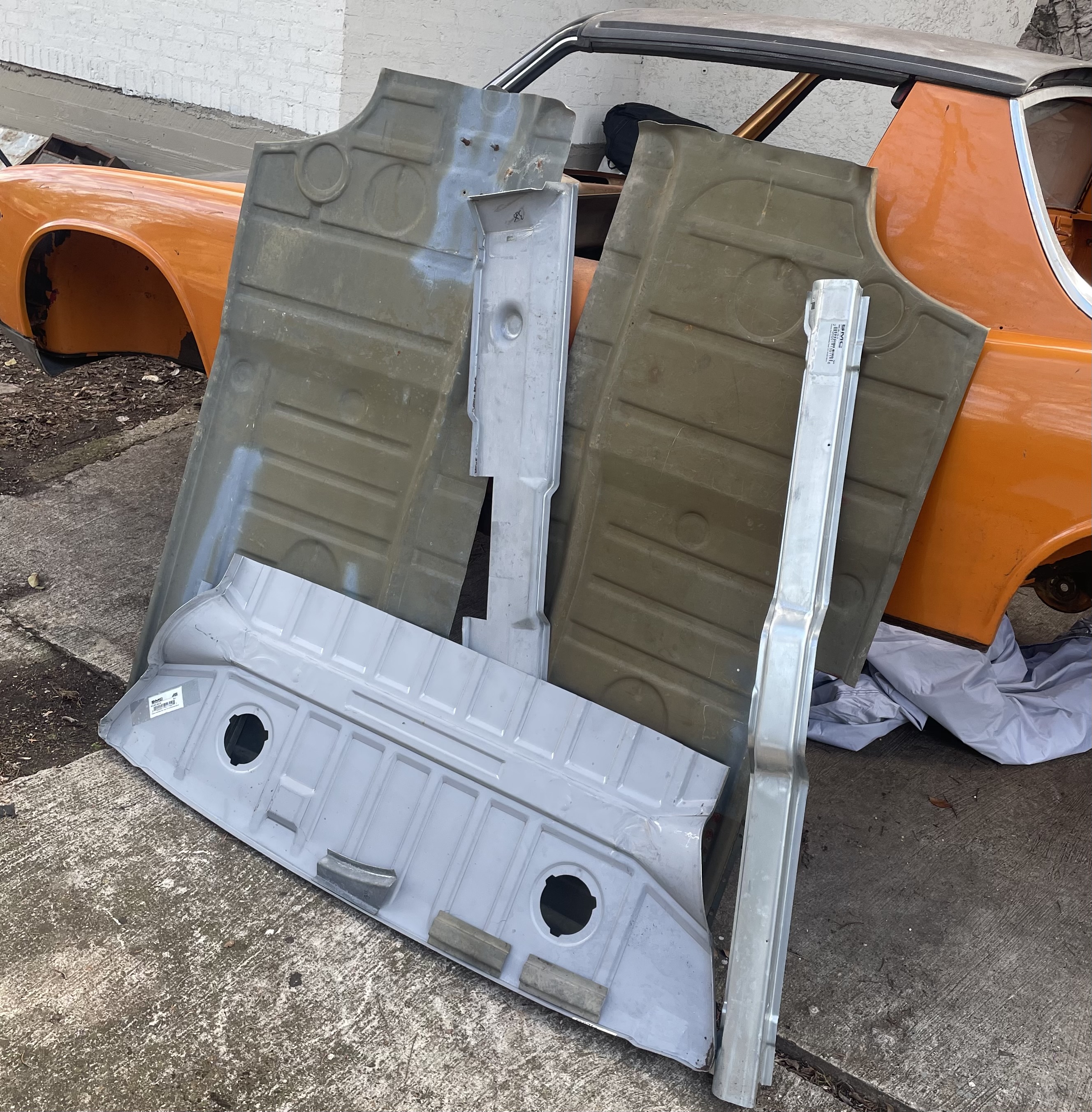 The floors were Swiss cheese (see the before pics) worse than I’ve seen on a car that I’d consider a good rebuild candidate tbh. PO used bondo to fill the holes, I kid you not. The back part of the rear trunk was terrible - had been patched with fiberglass cloth that water had gotten under. Then everything covered in a bedliner product that was only sticking in about 80% of it’s coverage, including wheel wells. The body itself was in pretty good shape.. the shell had even been recently painted (original Signal Orange), but done poorly, there is literally dried clear dripping at the wheel well edges. There are also some bubbles forming in a few spots under the paint that will now need to be addressed. Over the last few years I’ve sourced most of the missing parts (that cheap parts car is paying for itself in this one). I picked up a set of unused floors from a member here a couple years ago too.. as well as ordered other needed sheetmetal items for it. So I’m now ready to start restoration on this one. I like having a thread showing the process and the before/after but admit I’m not always the best at getting it all documented. Here’s the car as it sat a couple weeks ago (with random doors, roof, etc). Attached thumbnail(s) |
