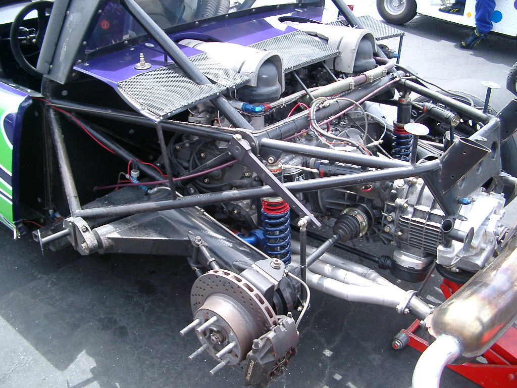 The 928 has the same issue. It requires bushing compliance which is fine on a street car, but a race car requires a higher degree of suspension control. Sheridan runs two toe adjustment rods on his car. Check this next picture notice the upper and lower rods. Sheridans car is grandfathered in as is Blakewell's car. SCCA put a change in the rules that require the shock/strut to run inside the spring. SO all further cars built after, I think 1997 (I don't have my rule book here) ahve to abide to the new rules. Also newer cars built after a certain date can run any type of rear suspension, in GT. But back to Production racing. When you adjust our rear suspensions you have to deal with moving the roll centers around. It will change the handling every time you adjust it. Now Finch likes to set the rear suspension where it needs to be and re-weld the stock trailing arms into position. Other than dealing with compliance in the rear suspension arms this is not a bad way to go. I would build a new arm all together and set it where you need to be. Problem with this approach is you are pretty much fixed as far as suspension settings go. Having adjustment is good which keeps bringing me back to Sheridan's rear suspension design. Attached thumbnail(s)