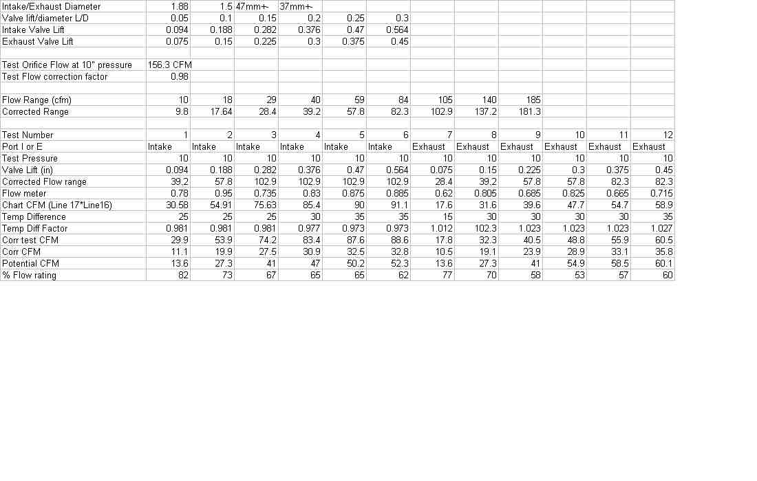 Error message telling me no bad boy go away... So try to decipher this Intake/Exhaust Diameter 1.88 1.5 47mm+- 37mm+- Valve lift/diameter L/D 0.05 0.1 0.15 0.2 0.25 0.3 Intake Valve Lift 0.094 0.188 0.282 0.376 0.47 0.564 Exhaust Valve Lift 0.075 0.15 0.225 0.3 0.375 0.45 Test Orifice Flow at 10" pressure 156.3 CFM Test Flow correction factor 0.98 Flow Range (cfm) 10 18 29 40 59 84 105 140 185 Corrected Range 9.8 17.64 28.4 39.2 57.8 82.3 102.9 137.2 181.3 Test Number 1 2 3 4 5 6 7 8 9 10 11 12 Port I or E Intake Intake Intake Intake Intake Intake Exhaust Exhaust Exhaust Exhaust Exhaust Exhaust Test Pressure 10 10 10 10 10 10 10 10 10 10 10 10 Valve Lift (in) 0.094 0.188 0.282 0.376 0.47 0.564 0.075 0.15 0.225 0.3 0.375 0.45 Corrected Flow range 39.2 57.8 102.9 102.9 102.9 102.9 28.4 39.2 57.8 57.8 82.3 82.3 Flow meter 0.78 0.95 0.735 0.83 0.875 0.885 0.62 0.805 0.685 0.825 0.665 0.715 Chart CFM (Line 17*Line16) 30.58 54.91 75.63 85.4 90 91.1 17.6 31.6 39.6 47.7 54.7 58.9 Temp Difference 25 25 25 30 35 35 15 30 30 30 30 35 Temp Diff Factor 0.981 0.981 0.981 0.977 0.973 0.973 1.012 102.3 1.023 1.023 1.023 1.027 Corr test CFM 29.9 53.9 74.2 83.4 87.6 88.6 17.8 32.3 40.5 48.8 55.9 60.5 Corr CFM 11.1 19.9 27.5 30.9 32.5 32.8 10.5 19.1 23.9 28.9 33.1 35.8 Potential CFM 13.6 27.3 41 47 50.2 52.3 13.6 27.3 41 54.9 58.5 60.1 % Flow rating 82 73 67 65 65 62 77 70 58 53 57 60 R |
