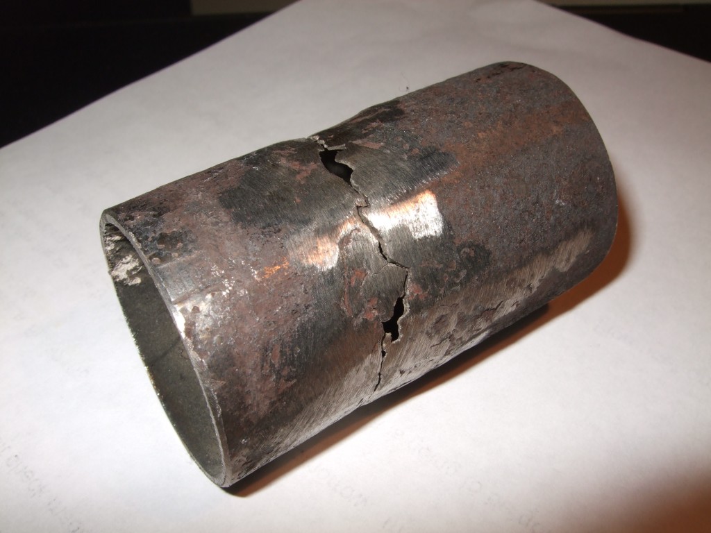 This was obviously not a split at the seam formed when the pipe was rolled. I'm having a hard time wrapping my mind around how this could happen. (IMG:style_emoticons/default/blink.gif) That crack goes 270 degrees around the circumference of the pipe. stress crack ... maybe the car was run without a muffler hanger for a extended period of time ... (IMG:style_emoticons/default/idea.gif) Andy i'd bet an explosion (IMG:style_emoticons/default/blowup.gif) . too much fuel + trapped in heat = (IMG:style_emoticons/default/blowup.gif) besides it looks puckered out |