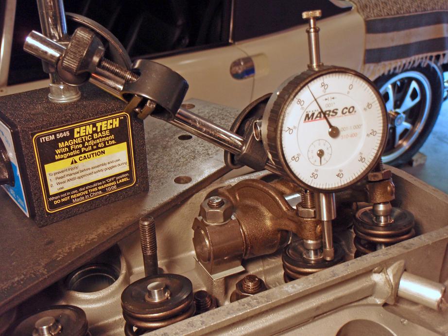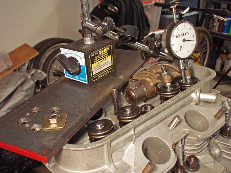 A couple details: Solid spacers and swivel head adjusters. I sanded down some of the adjusters with very fine sand paper as some of the rockers fit pretty tight when first mocked the assemblies on the case. I've got them so they rock smoothly with no side to side play. Steel pushrods. I cut them with a small pipe cutter and finished off with a grinder, deburred with a small file. Blew them clean with carb cleaner and compressed air. I had two old lifters that I used to hold the ends while I tapped in the pushrod tip. My set up, as you can see is just a steel plate (the piece I used as a crank holder earlier in the build). Worked great to mount the magnetic dial indicator stand. All measurements at full lift are within +/- 5% lift specs for the 9550 cam. At half lift, the valves and adjusters are about as straight as I can possibly see: Assemble, measure, disassemble, adjust, reassemble, repeat... Lot's of fun! Here's a couple random pictures from the process: Attached thumbnail(s) |