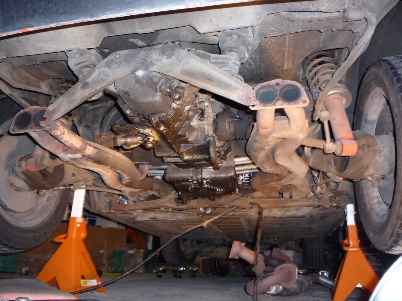 Well I didn't make much progress this morninng. I had a 2 hour window that got interupted a few to many times. Still I just need to disconnect the cv's from the tranny flanges. Then I'm ready to drop it. Not going to happen today as I have to head out for my girls bball games. Here are a few pics just so you know I actually started