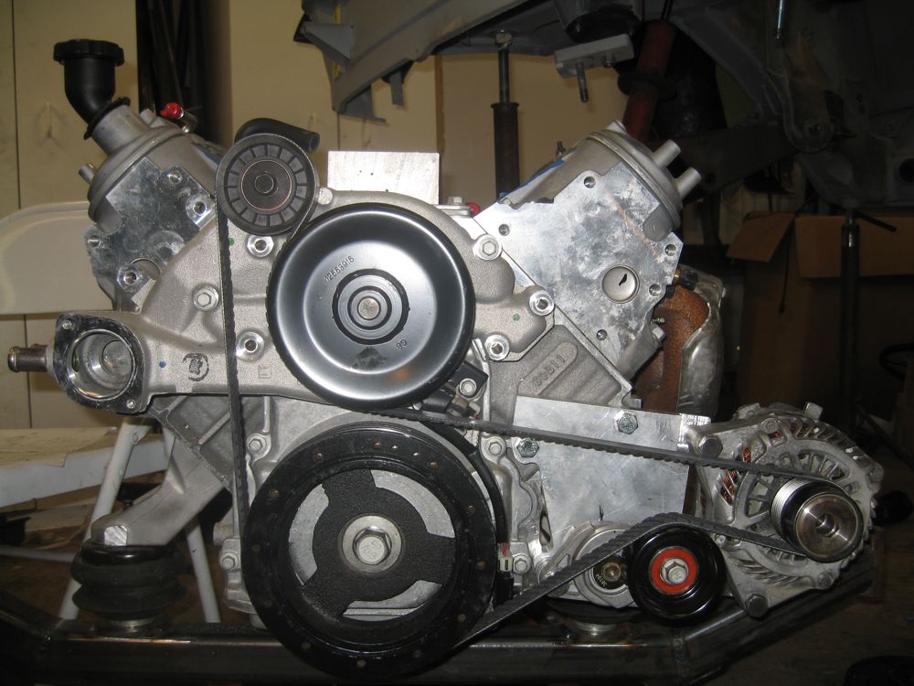 Finally figured out a bracket to hold the alternator. Here is the aluminum chunk: Alternator, guide pulley, tensioner and belt installed. To allow room for everything and tuck stuff into the firewall center bumpout, anything that is high, must be centered, ie water pump and idler pulley. Anything that is low, can be wide, ie alternator and tensioner, Machined a plug for the water pump outlet that does double duty. It seals this hole and is the bracket for the upper idler. Will need to drill the water pump for a water outlet in a better spot. |