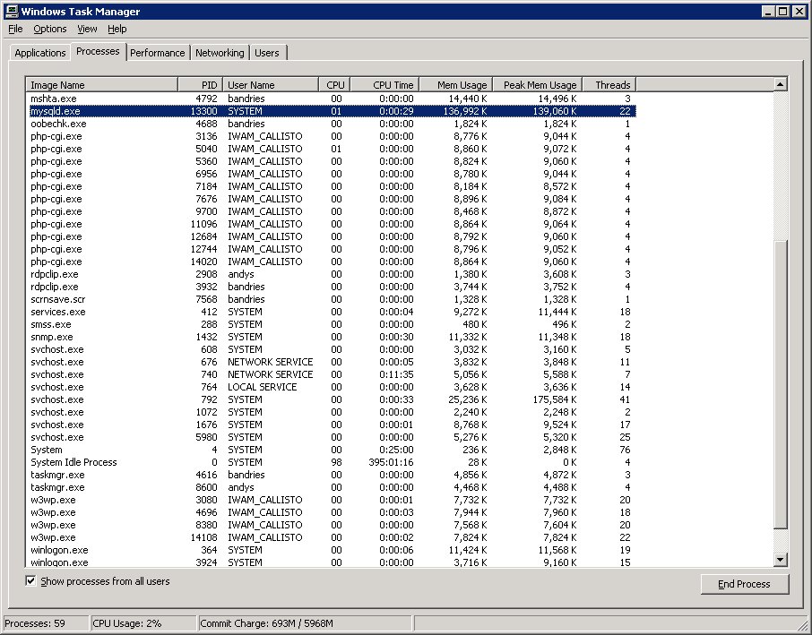 So, Win2008 server is finally multi threading properly? I'm running 4 instances of IIS each with 4 instances of FastCGI with each FastCGI instance handling up to 32000 concurrent connections. You do the math. (IMG:style_emoticons/default/biggrin.gif) In the screenshot below you can see the 4 IIS instances (w3wp.exe) and the current instances of FastCGI (php-cgi.exe). The load on the server when i took the screenshot was 2959 hardware devices sending large blocks of data back to that server. Granted, this runs on a box with some pretty good hardware, but the performance is pretty damn good. The 4 CPUs rarely go over 5% usage ... I do have pages of stress testing logs where we hit the server with thousands of concurrent connections sending large data blocks for days in a row. We did the same with two (different) Linux servers on similar hardware. (IMG:style_emoticons/default/popcorn[1].gif) Andy Attached thumbnail(s) |