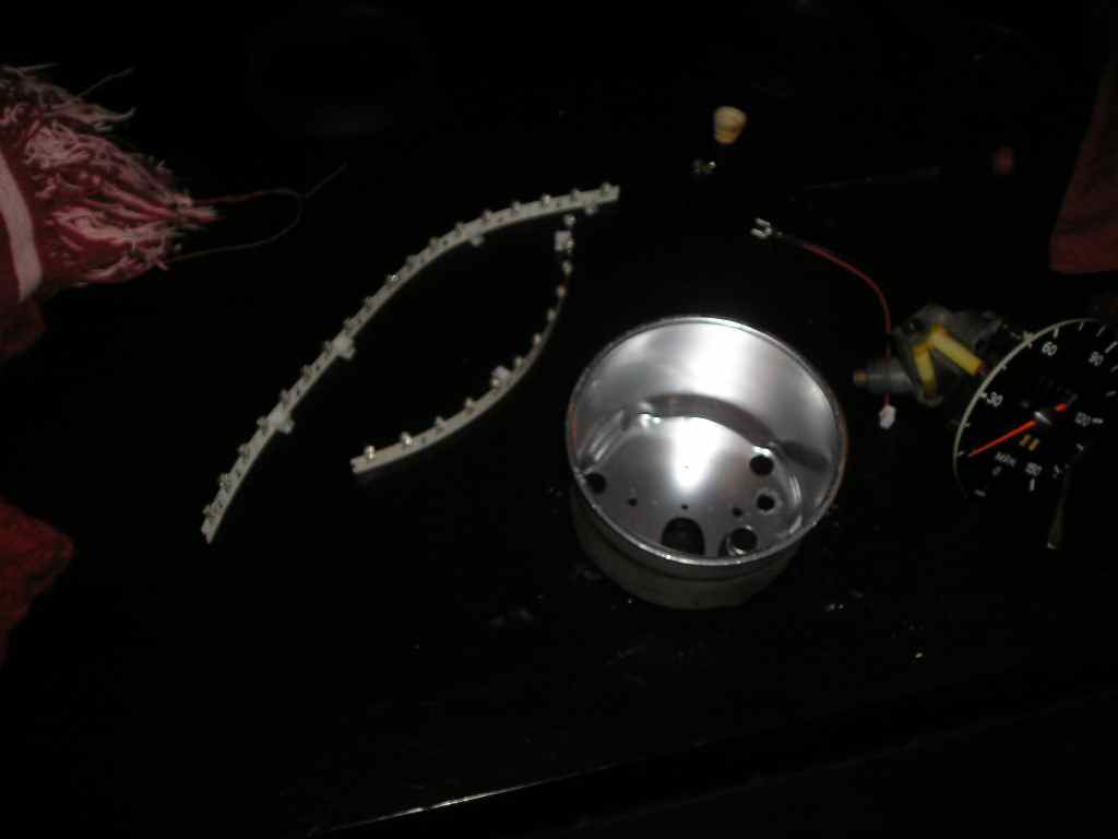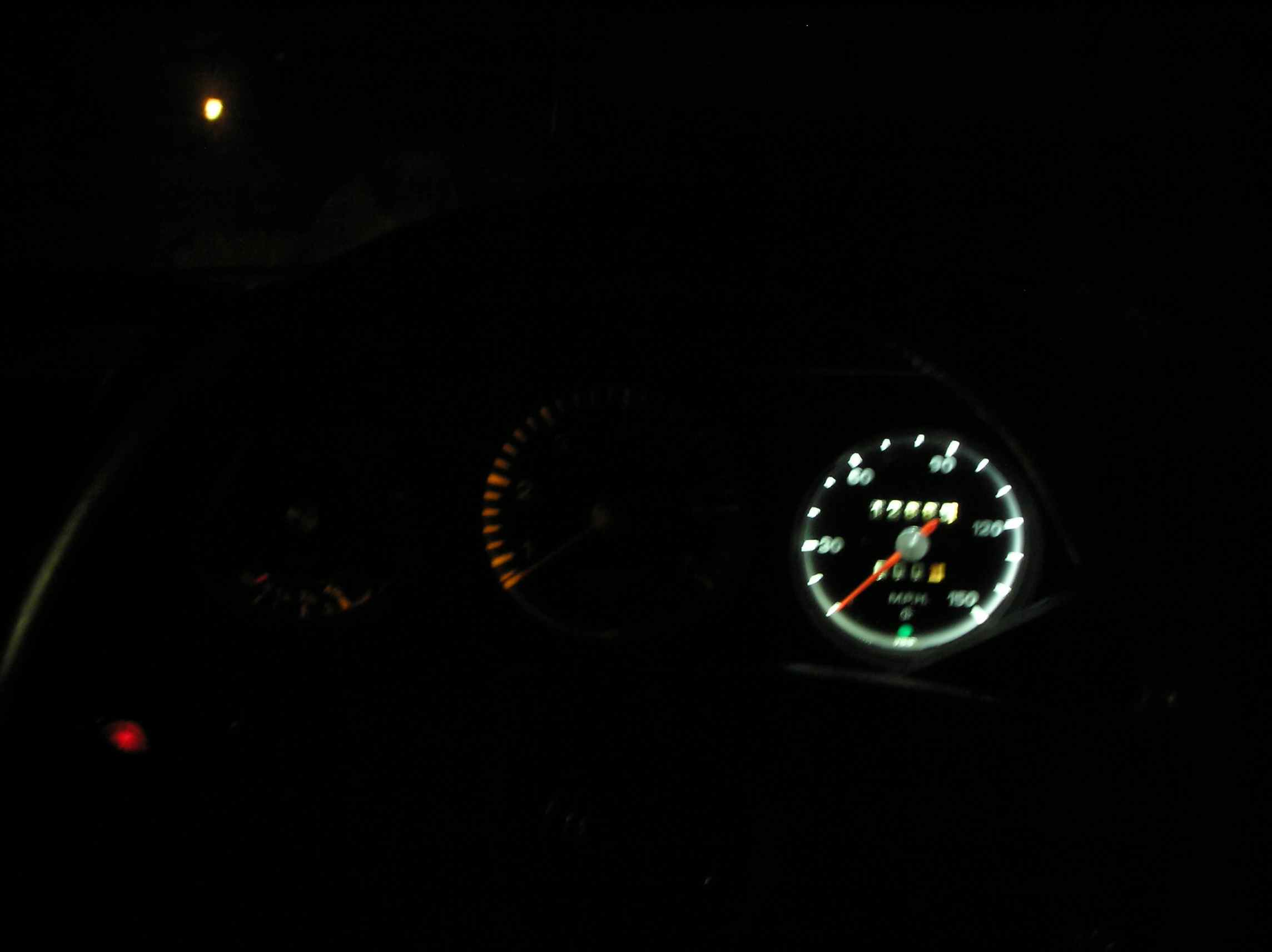 (I apologize for the blurry pictures) I took the gauges apart, painted the interior housing a more reflective color, and installed a strip of LED's and wired it out the back. The difference is staggering. The parts... After I finished the speedo. This shows a big difference. I might be able to see my gauges now... (IMG:style_emoticons/default/w00t.gif) Complete assembly. I also painted the rings on all three gauges as well as the mounting plate. Now I just have to do the center console gauges. |