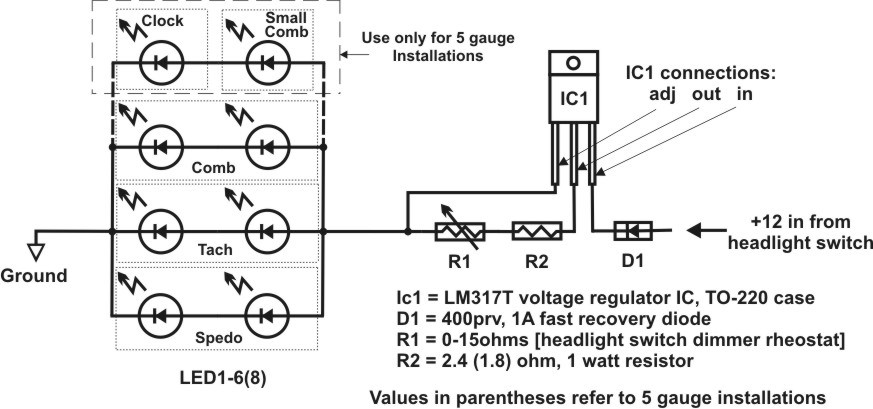 I’ve seen some threads on changing the instrument bulbs to LEDs, and noticed that several of the respondents have wanted a scheme, not only for dimming the LEDs, but one that also uses the existing rheostat built into the headlight switch to do this. I built a system like this for my car, so I thought I’d post a how-to covering what I did.