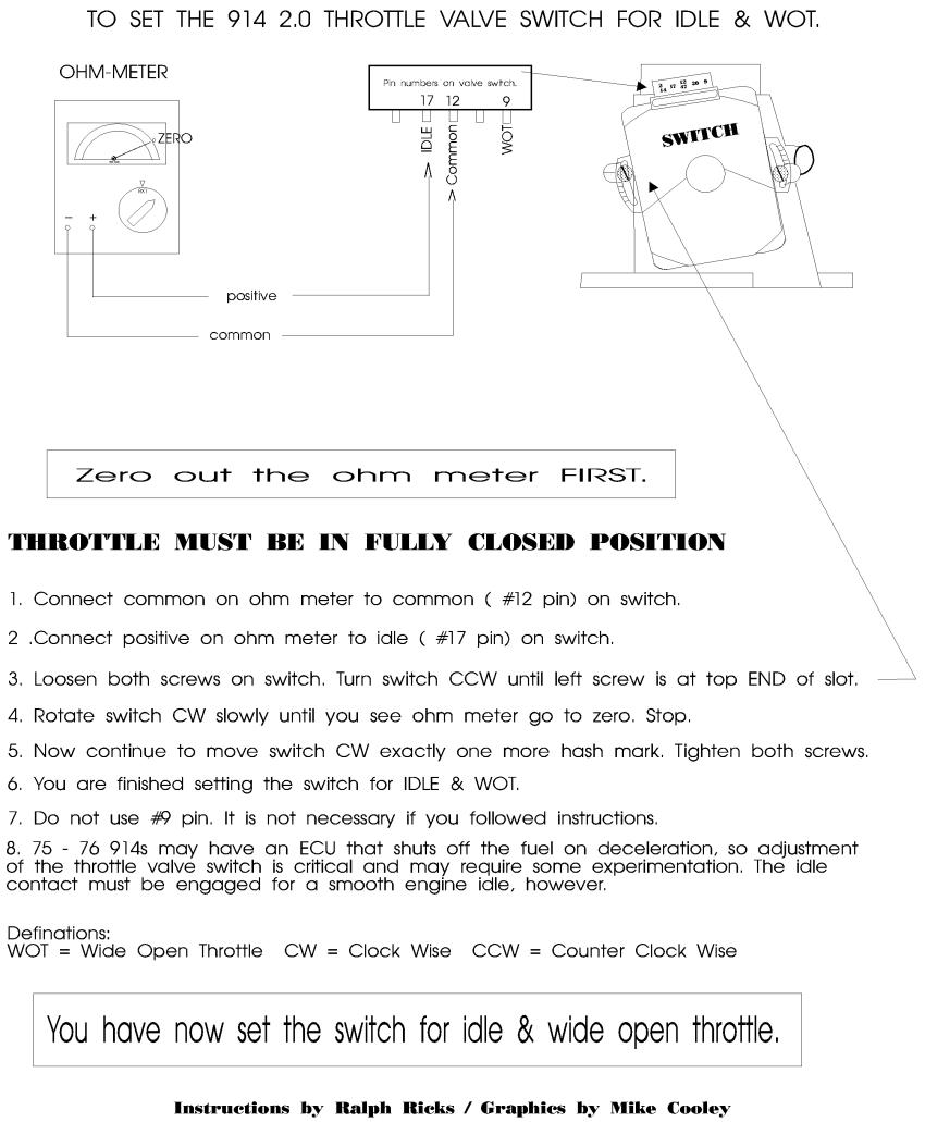 I purchased and installed the new TPS, but I'l having some difficulty in adjustment. Using the following adjustment guide, I tried to perform as directed: But I just can't seem to get the Ohm Meter to go to zero. Now, please take a look at my TPS: ![]() Should the wires "C" between post "A" and post "B" always short between these posts, or is there an offset where the wire only either contacts post "A" or post "B", but never both at the same time? In looking at my TPS, can you see anything else which my be causing my problems? I drive a 1974 2.0L stock FI engine. My thanks in advance. Eric Read Eric, the switch is designed with hysteresis (backlash) so that contact C is shorted either to post A OR to post B, but never to both simultaneously. In this way, the ECU can detect an opening throttle vs. a closing throttle. But here is the problem with your TPS -- you've got a 2.0 liter board mounted in a 1.7 liter sensor plate. The 1.7 liter throttle rotates the opposite direction, so your mismatched sensor will never detect idle. |
