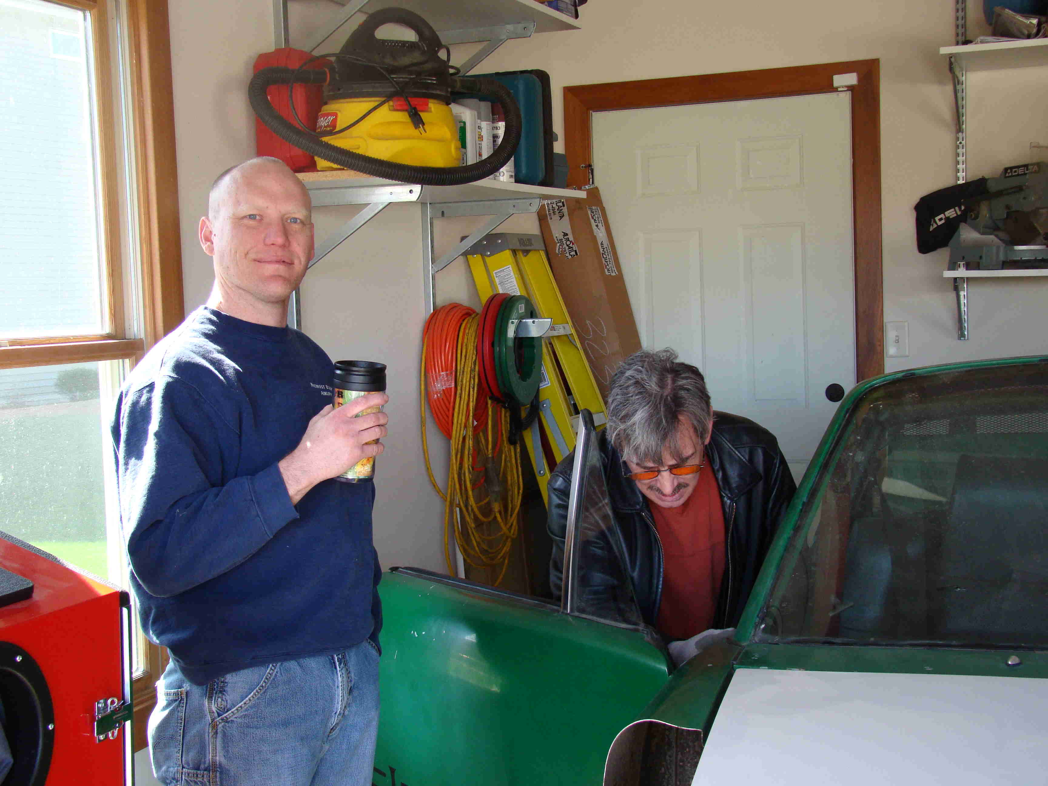 When Rick was through the door closed like butter. We ended up swapping out the door latch with one of my spares. I found out that was half my problem. Here's a picture of me relaxing while Rick does the work. This was the first time I let someone else touch one of my project cars. I usually do all the wrenching. This one was beyond me. One false move and it would be tweaked the wrong way. I kept one hand in my pocket and the other on the coffee cup. Rick knows what he's doing. I just tried to stay out of the way.