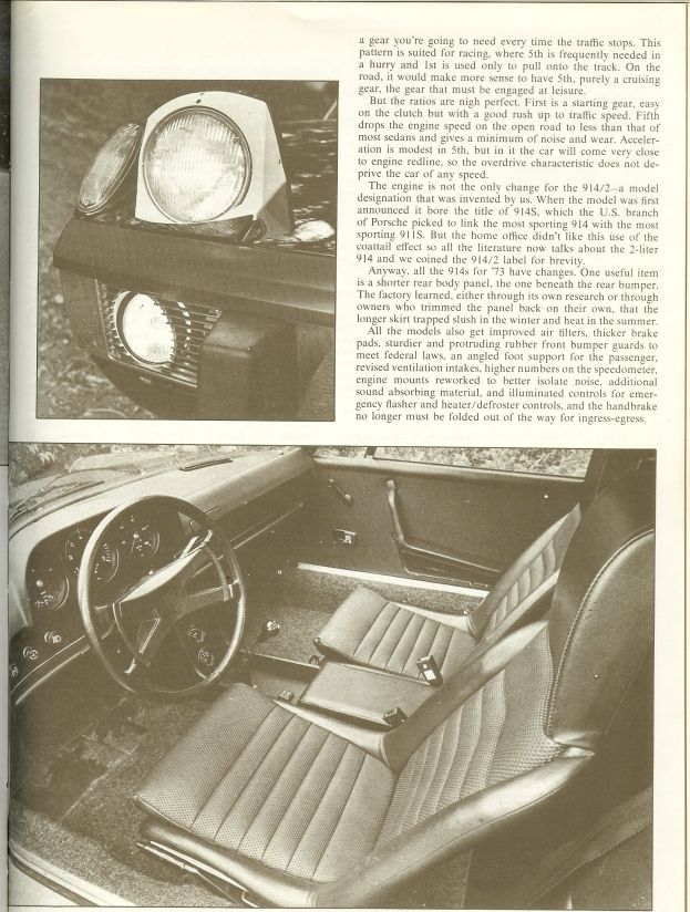 For the ADHD crowd & reading challenged & the just impatient.... The `73 MY's "914S" is a "Trim Designation" or "Trim Package" - the same as was the "914 LE" in the `74 MY. It was official by Porsche & Porsche+Audi/Volkswagen of America for North America, & likewise for th Porsche distributors of the "914S/914SL" in Japan & "914SC" in the UK. However, in the case of North America, Porsche Germany made Porsche+Audi/VoA drop the "914S" designation after running the program for over a year - from early -1972 in the pre-release campaign - through about March 1973 - apparently after pressure from the 911 crowd at PCA objecting to it confusing them over their911S's. (IMG:style_emoticons/default/dry.gif) Period! (IMG:style_emoticons/default/shades.gif) See my Post #205 on page 11 for more details - or just read on below & through the ensuing facts, then debate by the naysayers. (IMG:style_emoticons/default/dry.gif) <edit> CLIFF NOTES VERSION: (IMG:style_emoticons/default/huh.gif) - for those not interested in looking at cool old 914 stuff from back in the day"! 1. Porsche+Audi marketed the 914/4 2.0 "fully loaded" as the "914 S" in ads & sales brochures from Summer 1972 to about Jan/Feb 1973, then Porsche made them stop. 2. The British Distributor similarly marketed the 914/4 2.0 from Summer 1972 through 1976 as the 914SC, but was never told to stop. 3. Neither was ever badged as either a 914S or 914SC. 4. If one is interested, read the stuff posted here from that 1970's period. <end edit> There has been talk from time to time on here & elsewhere, about whether there ever really was a "914 S" &/or "914 SC"? (IMG:style_emoticons/default/confused24.gif) - especially amongst those of us with USA 1973 MY 914-2.0's from the first half of the 73 MY production! Well - as many things 914 - the answer is an unequivocal "Yes & No"! I can answer more definitively regarding the "914 S" in the USA & Canada/North America, since I researched that recently to better plan for the restoration of my early-73 914-2.0. However, I was already well aware of the "914 S" terminology back in 1975 & it's having been dropped unceremoniously at PAG's insistance during early 1973, because I'd reviewed MT & R&T road test articles on the "914 S"/914-2.0 which bracketed the change & made mention of PAG's forcing it to be dropped while researching the purchase used (3 yrs. old) of my one & only 914-2.0 which I bought in Dec. 75 & still own (2nd owner). I also had 3+ years before that, gotten a "free" copy of the 12 page early 1973 MY 914 sales brochure from the Downtown LA Porsche+Audi dealership, from a classmate whose parents eventually bought him one for his graduation (oh to be so lucky! (IMG:style_emoticons/default/sad.gif) ). In it, it referred to the "914 S", as shown in the pix on the following posts here of the similar current brochure which I had to buy last year, having misplaced the other! (IMG:style_emoticons/default/dry.gif) But we will have to ask that some of our Brit Teeners out there (both of you! - just kidding! (IMG:style_emoticons/default/biggrin.gif) ) to add in regarding your "914 SC". - Yes, the Brits had "something completely different," as in the Monty Python bits! First - "No" - 914's were never officially badged as either a "914 S" nor "914 SC" by either the Porsche+Audi US/Canada nor the British Isles distributors, and definitely NOT EVER by the factory. North American 914s with the GA 2.0 motor were badged with the familiar separate "914" & "2.0" badges on the right rear body panel above the rear bumper & to the left of the right taillight. Whereas the rest of the world's 2L's with the GB engine were badged with the familiar long "914-*-Porsche" between the rear trunk lock/button & right taillight (where "*" is the VW roundel Logo), with the 2.0" badge below that & aligned with the first long badge next to the right taillight. USA/Canada - Porsche+Audi 914 2.0 Badging: ![]() . Rest of the World's 914 2.0 Badging: ![]() . <edit> For many, this above is enough to know & take/keep the position on "no" - but it is NOT the whole story, much of which is not known today unless you were around then. If you're in the no camp, your point is taken & no need to torture yourself by reading on - unless you want to add some other documentation/pix from the period which relate to this subject - then please do so. However, this post isn't here for a debate - although it seems that we have a lot of "master debaters" logging in here with a burning desire to prove someone - anyone - wrong. Even to the point of agreeing with me then saying I'm wrong, and one re-posting information which I'd already posted in an effort to prove me wrong! (IMG:style_emoticons/default/blink.gif) (IMG:style_emoticons/default/huh.gif) (IMG:style_emoticons/default/WTF.gif) I'm just presenting some factual documentation here on what the "914S" thing was all about - so others will know that there is some basis to it, even if it was not a "real" 914 model nor badge name. I have also thrown in some of my own thoughts, speculation & opinions, which I hope are clear from the way I've stated things (IMO, IMHO, I speculate or suspect or estimate that ... , etc.) that they are just that - which is not to claim that they are "facts". As you can tell by my edits here, I'm getting a bit frustrated with the "master debaters," conspiracy police, & those who consider "914S talk" as heresy - but it did exist - to a point, as the following explains & provides period documentation to back it up. To the point - it is an indisputable fact that Porsche+Audi in the USA & Canada marketed the then new 914/4 2.0L model as the "914S" from Summer 1972 through about December 1972 or January/February 1973 -period! (IMG:style_emoticons/default/dry.gif) <end edit> . Today, one of our member vendors here - RJMII - makes custom aluminum badges in a "914 S" design, and could customize anything else - including "914 SC" - should someone want one for display purposes or fun in