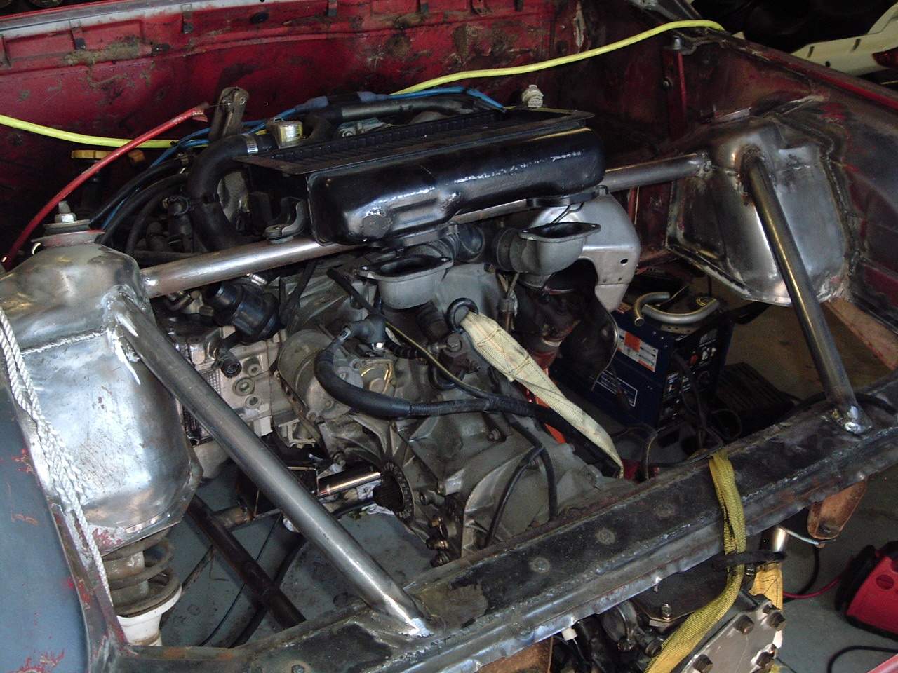 this is the engine in and the stock intercooler just setting in place. the strut tower bar is in the way but its just tacked in for now. so it could easily be moved out of the way. |